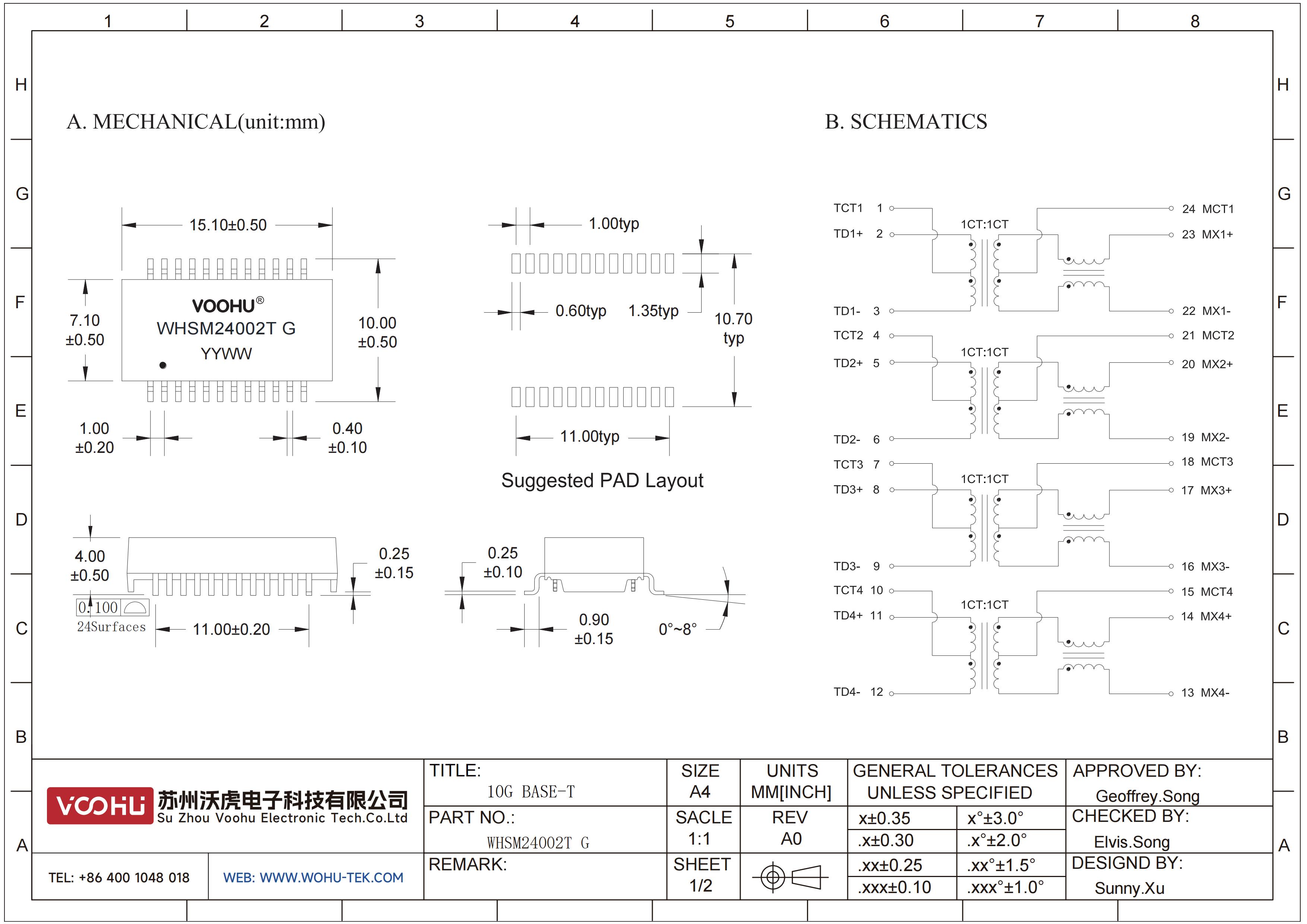 WHSM24002TG Dual Ports SMD 10G PIN24 non-PoE TRANSFORMER