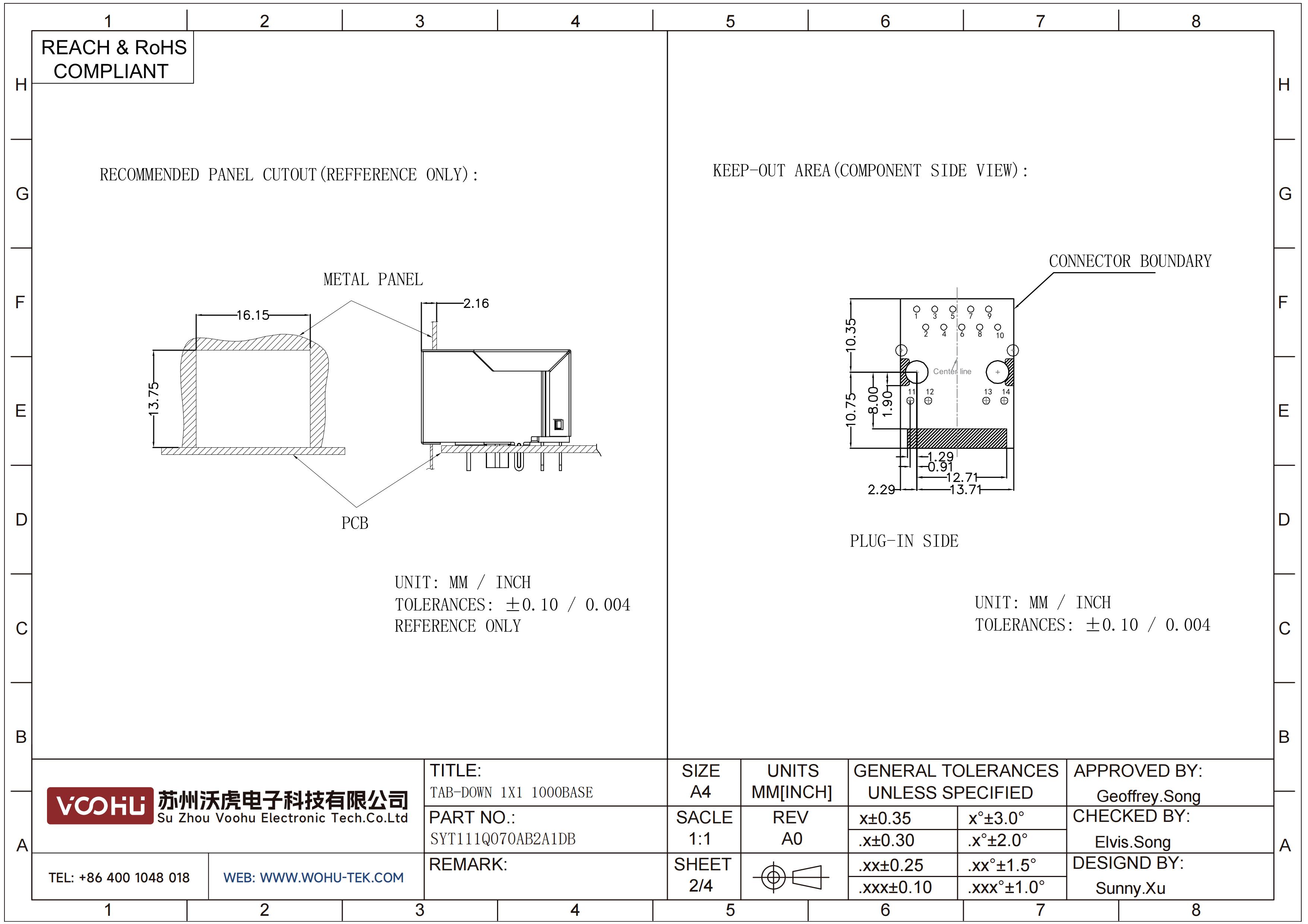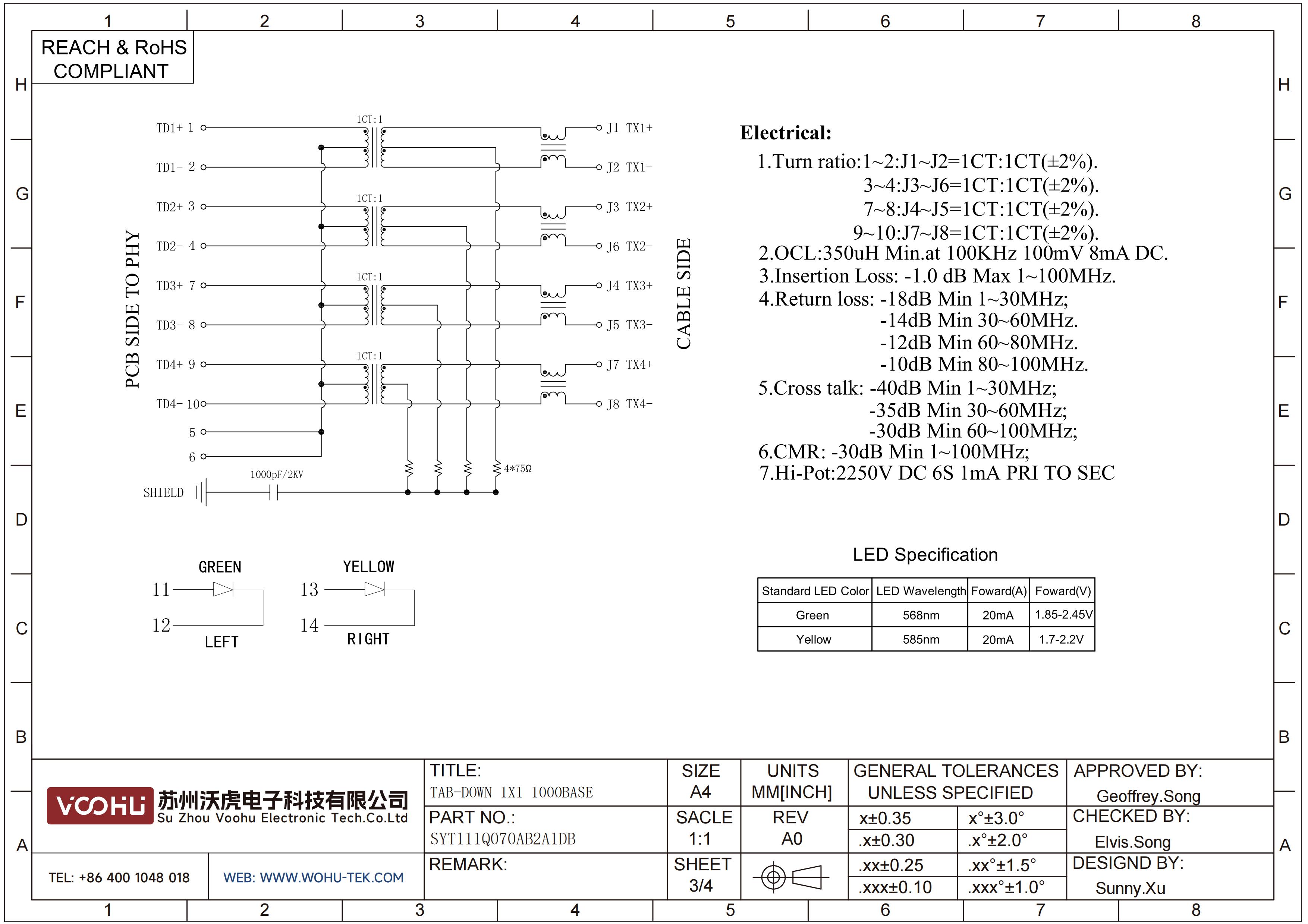 SYT311B075AA2A4DN 90° side insertion 1*1 Tab UP G/Y 10/100M DIP RJ45