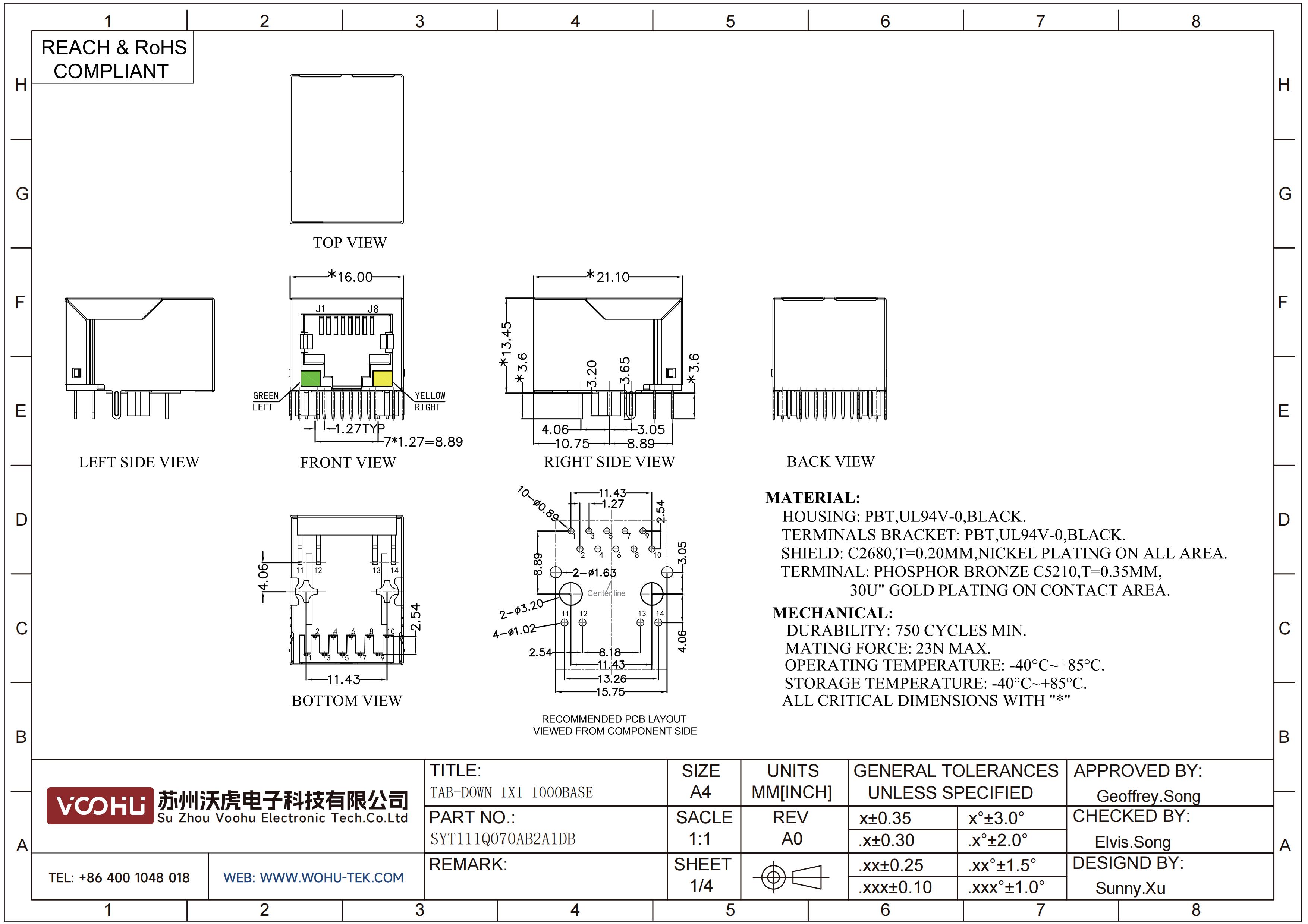 SYTRU231188AB1WDB1162 90° side insertion 1*1 Tab UP Y/G DIP RJ45+USB