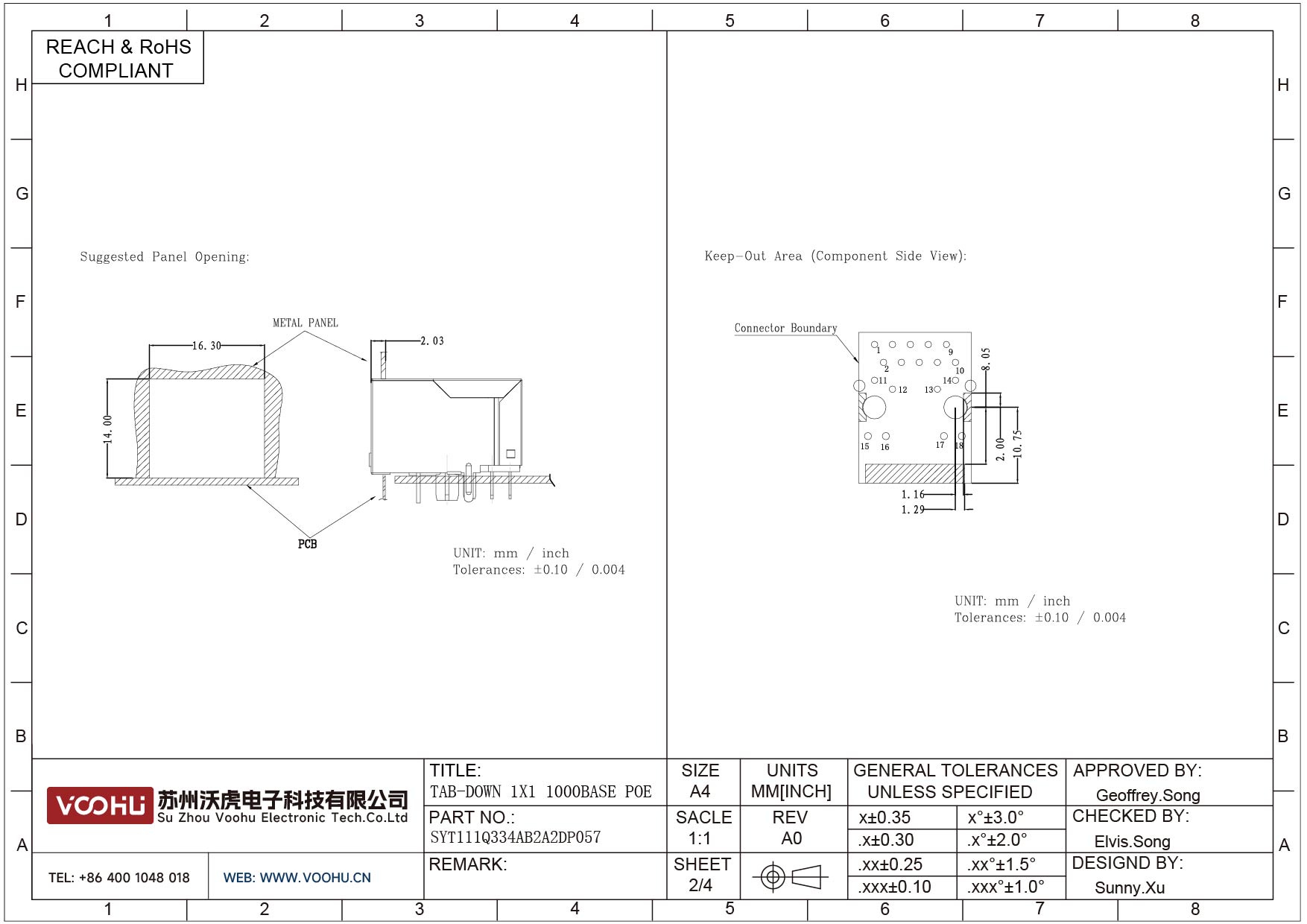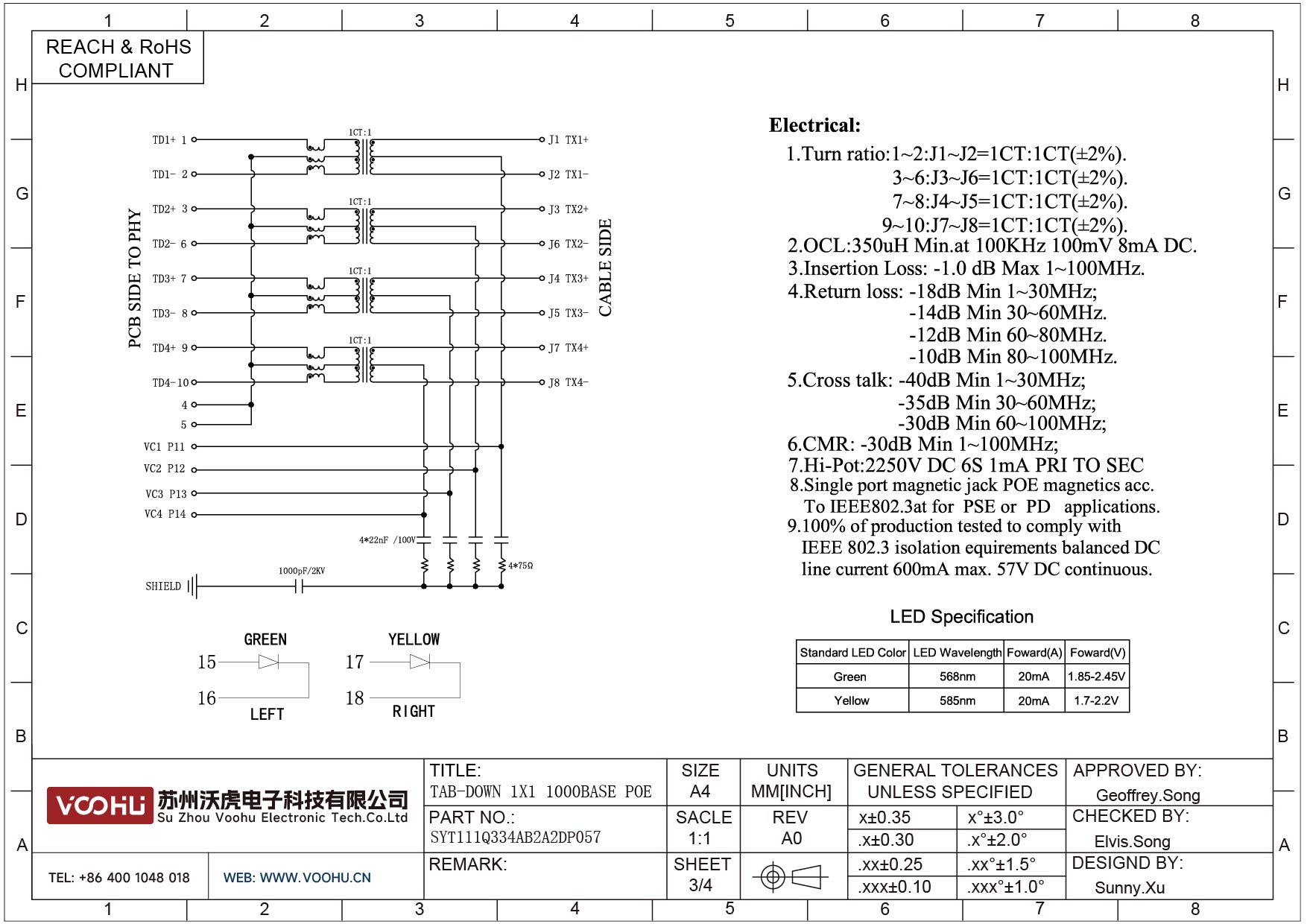 SYT111Q334AB2A2DP057 90° side insertion 1*1 Tab Down POE 600mA G/Y 100/1000M DIP RJ45