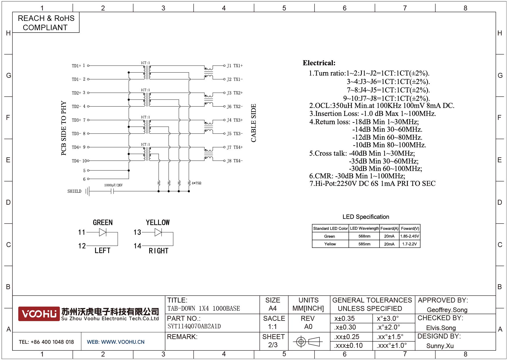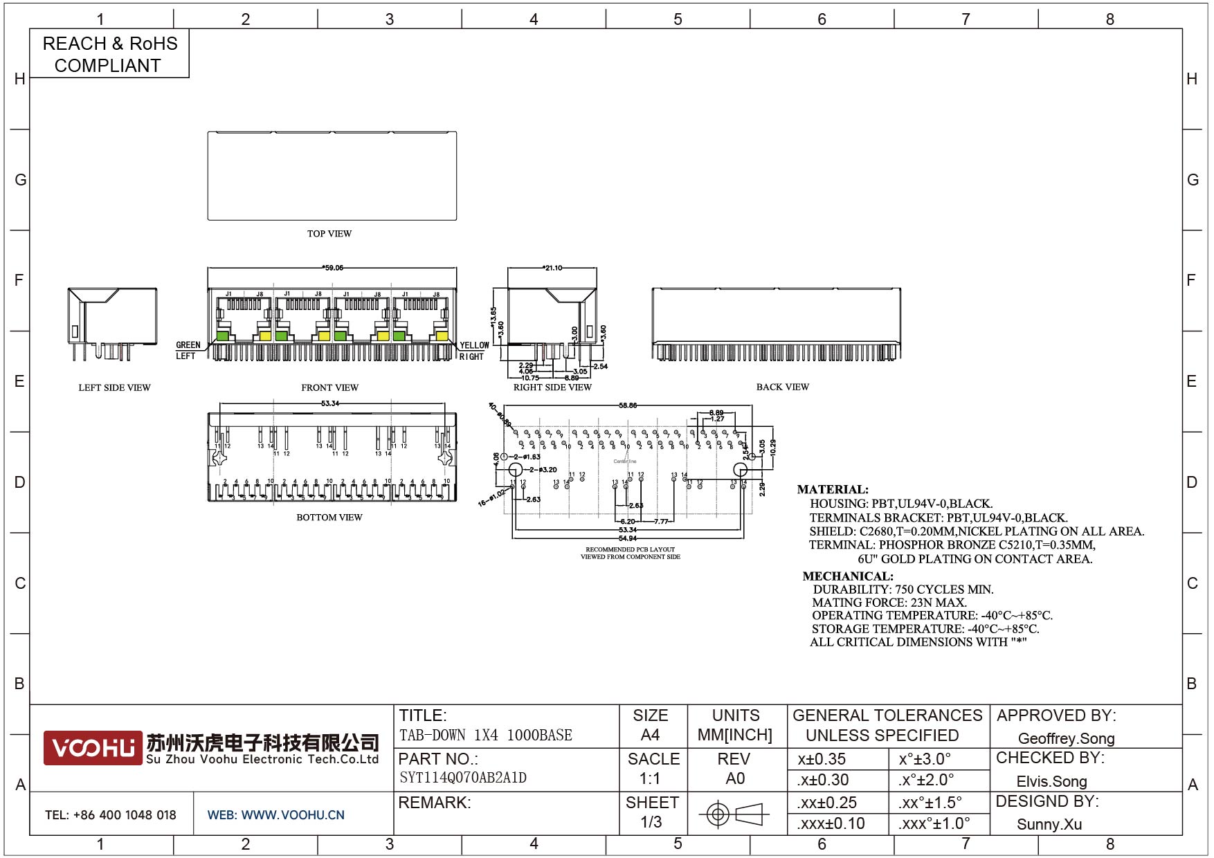 SYT114Q070AB2A1D 90° side insertion 1*4 Tab Down 100/1000M LED G/Y DIP RJ45