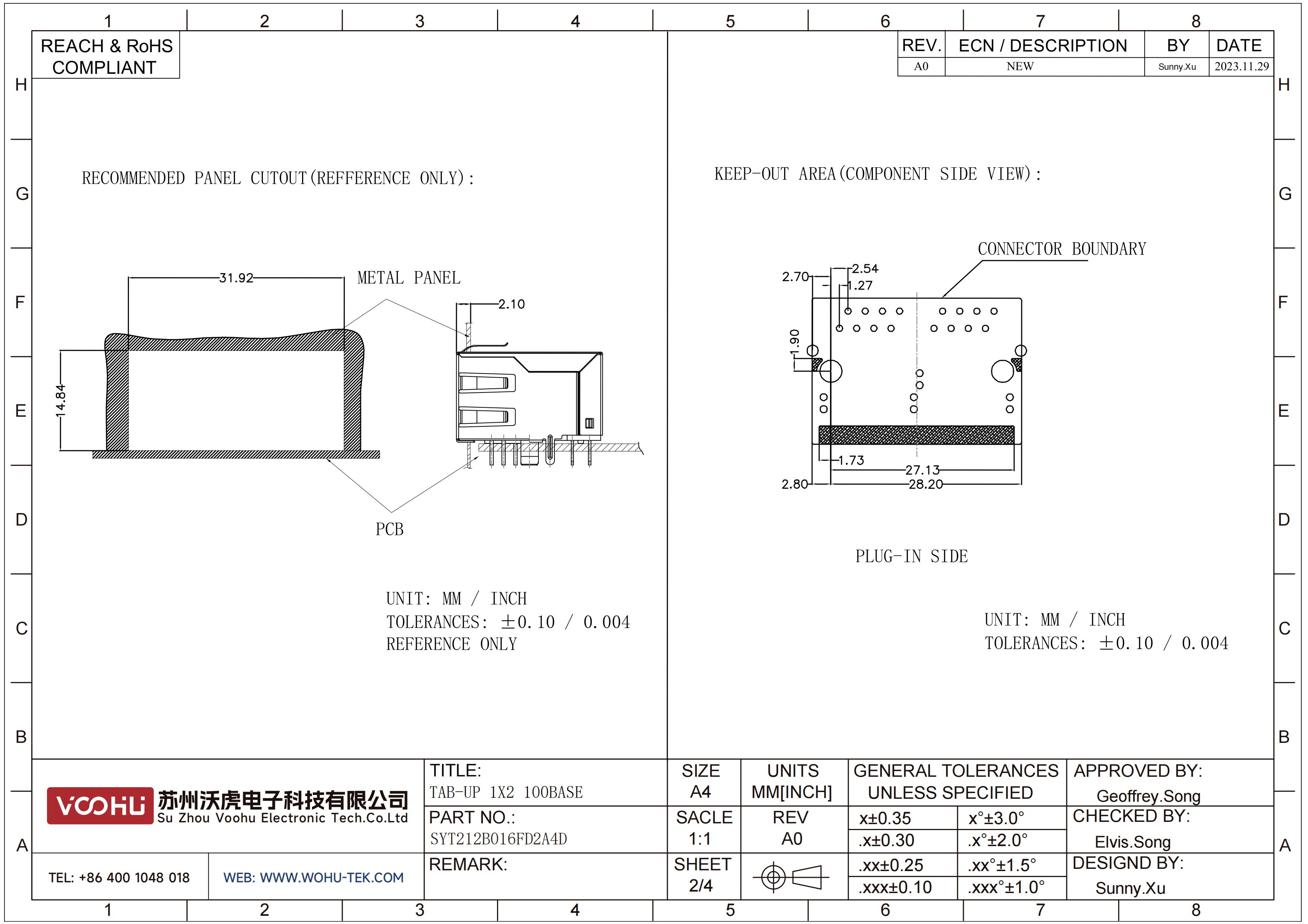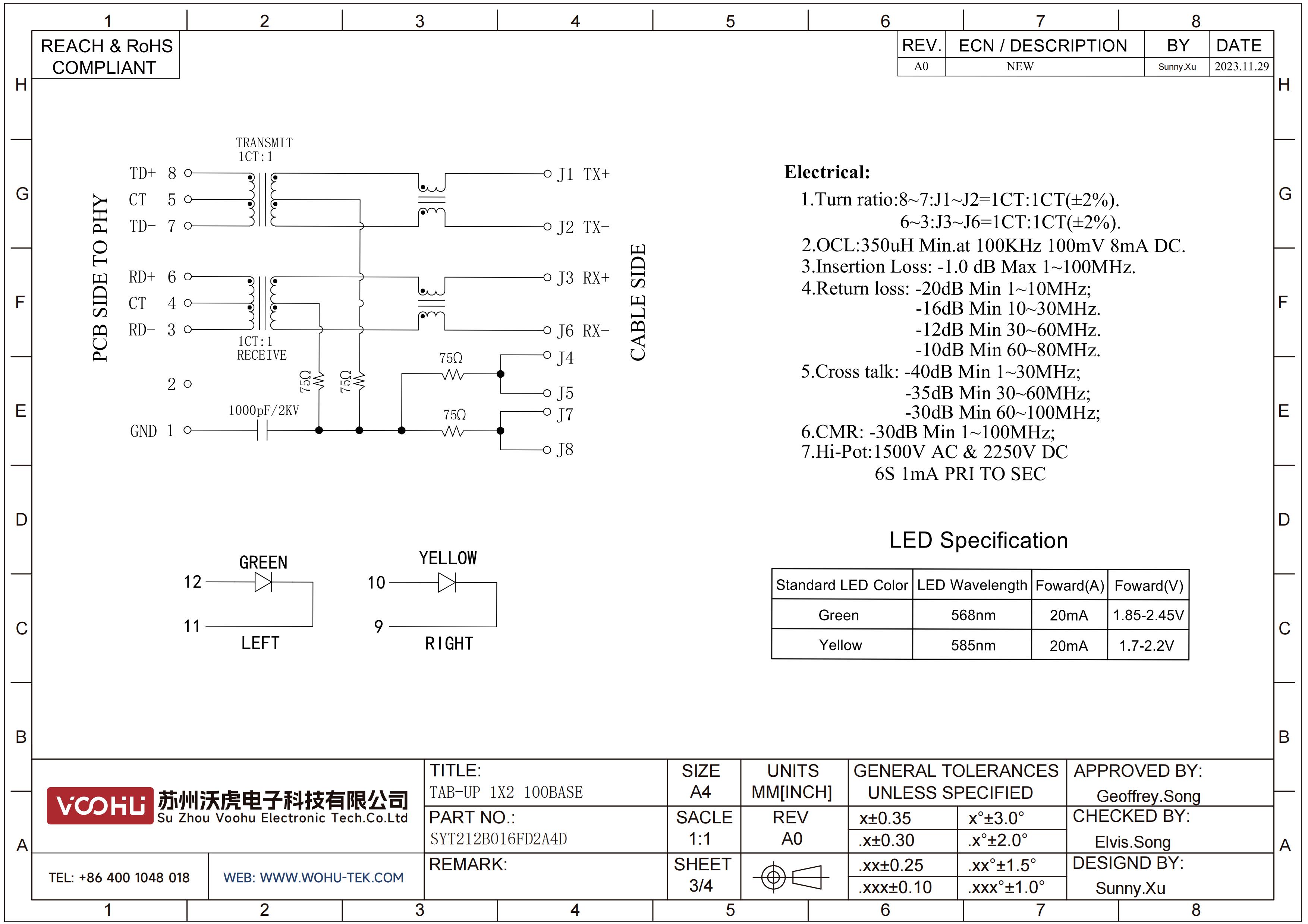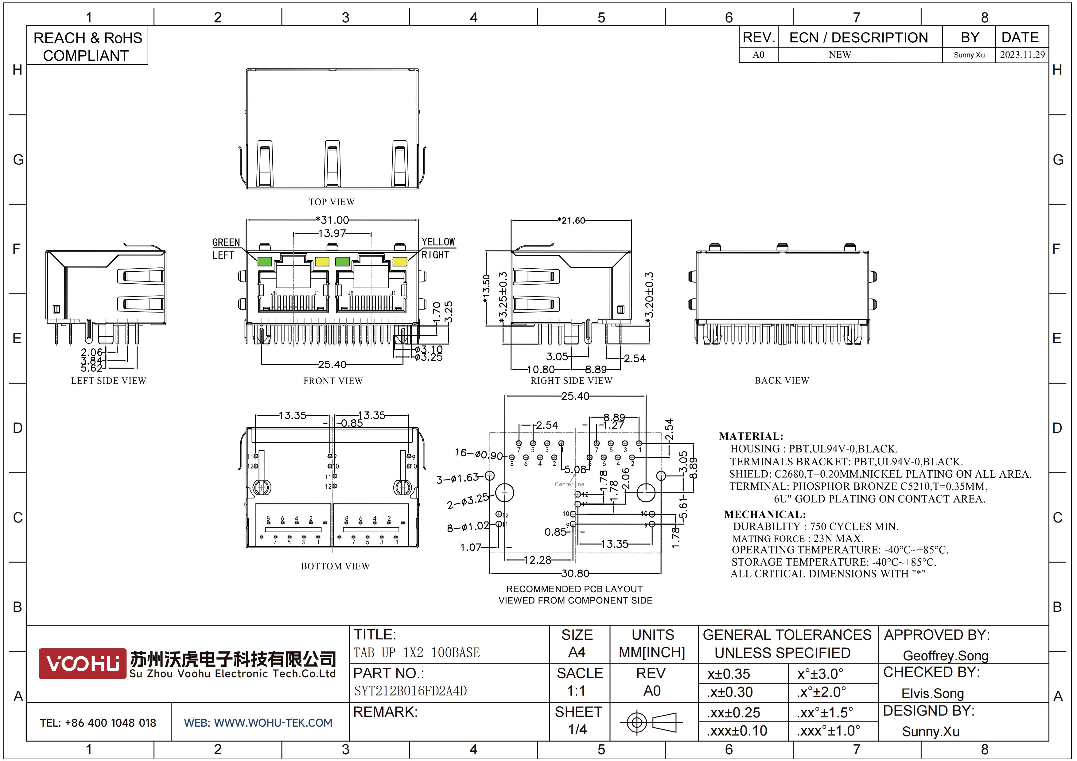 SYT114Q070AB2A1D 90° side insertion 1*4 Tab Down 100/1000M LED G/Y DIP RJ45