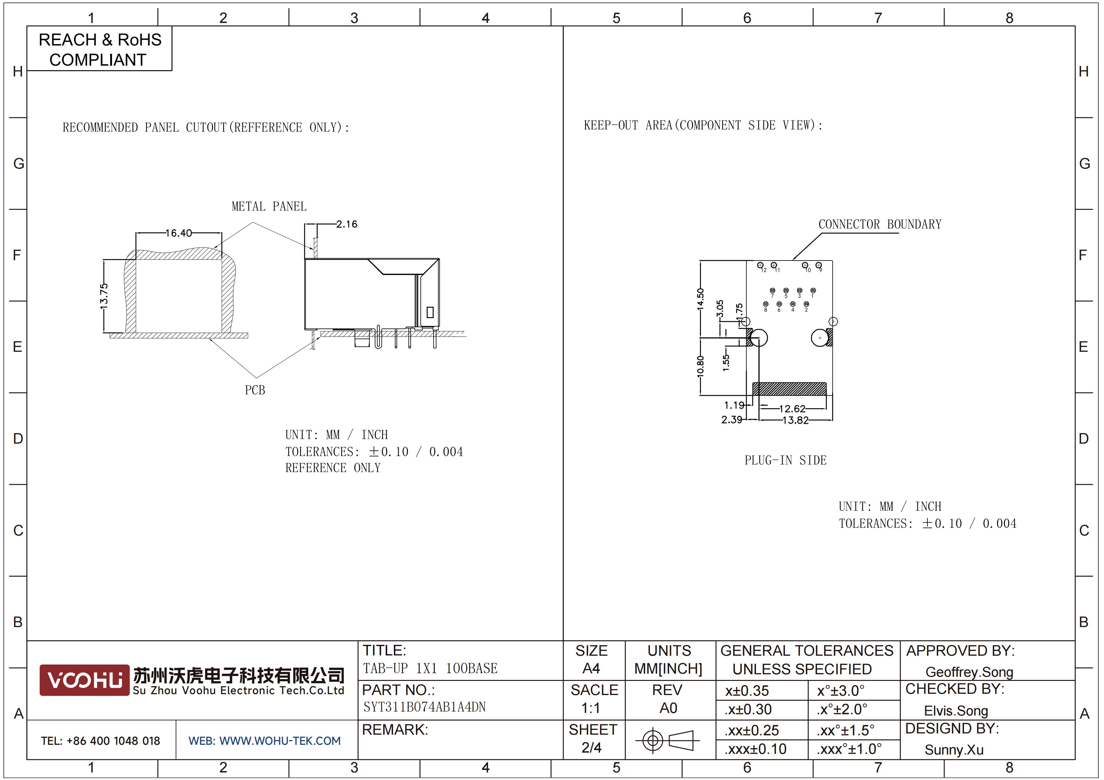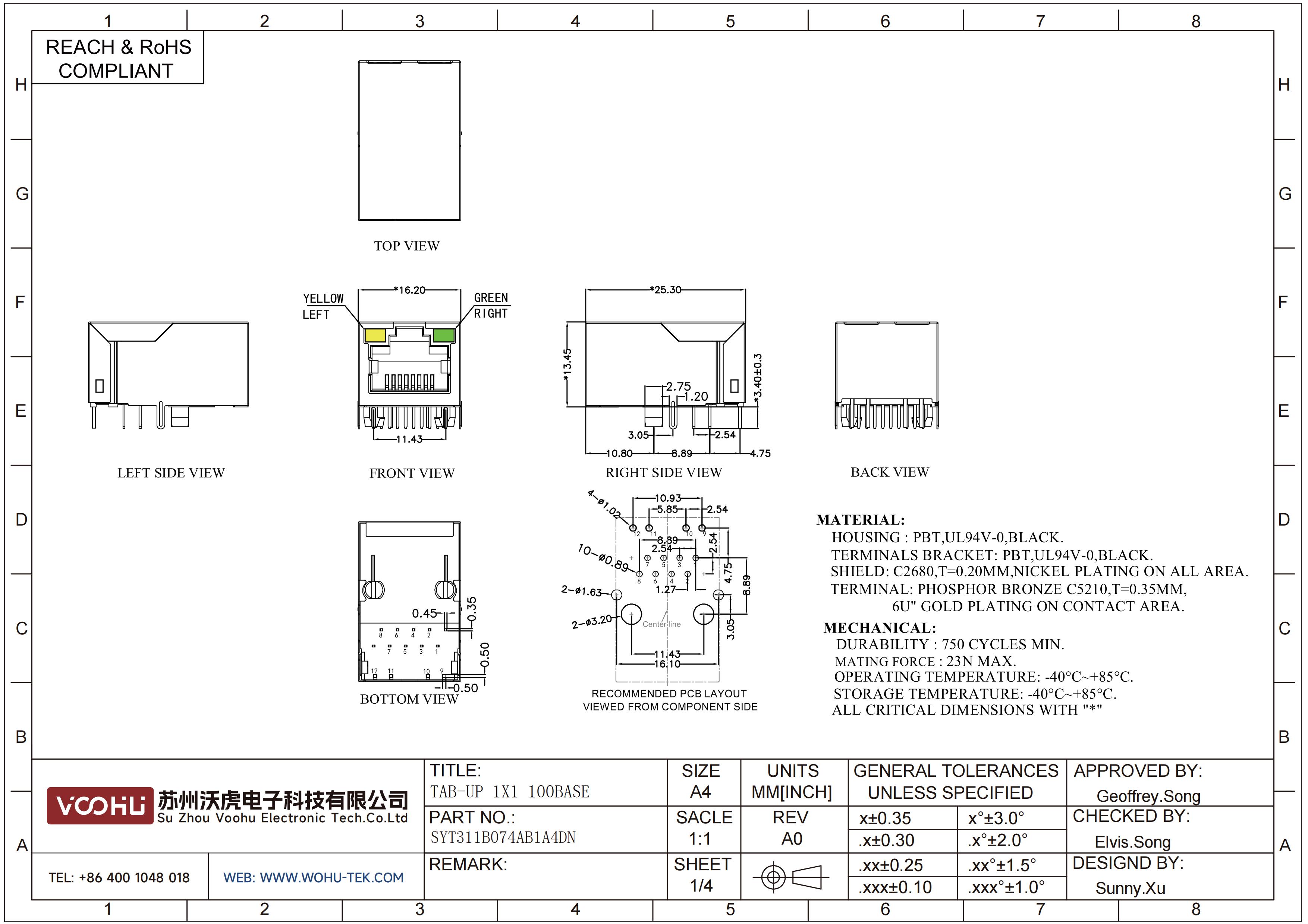 SYT311B074AB1A4DN 90° side insertion 1*1 Tab UP Y/G 10/100M DIP RJ45