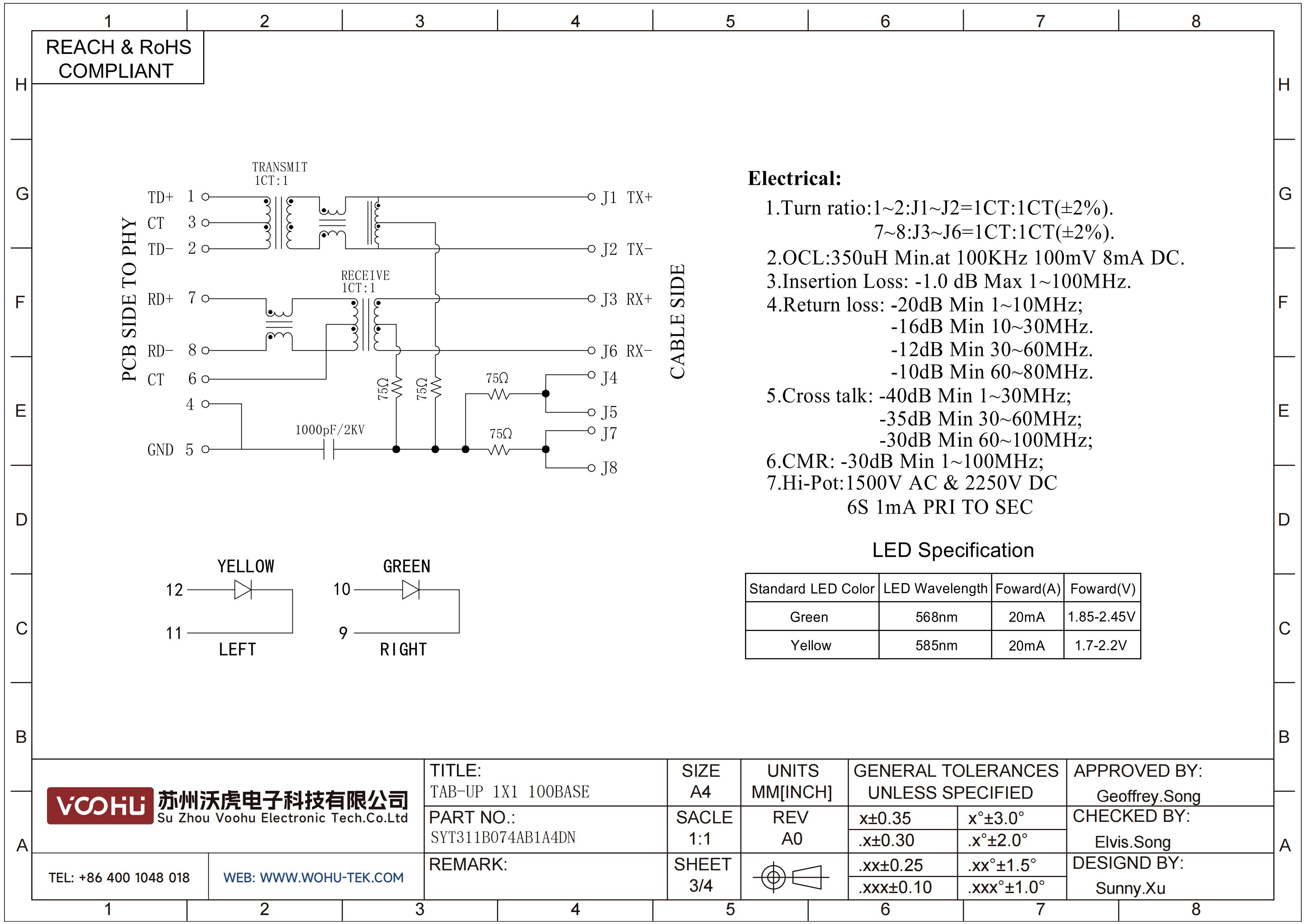 SYT511Q070AB2A8D 180° vertical 1*1 Tab UP 100/1000M LED G/Y DIP RJ45