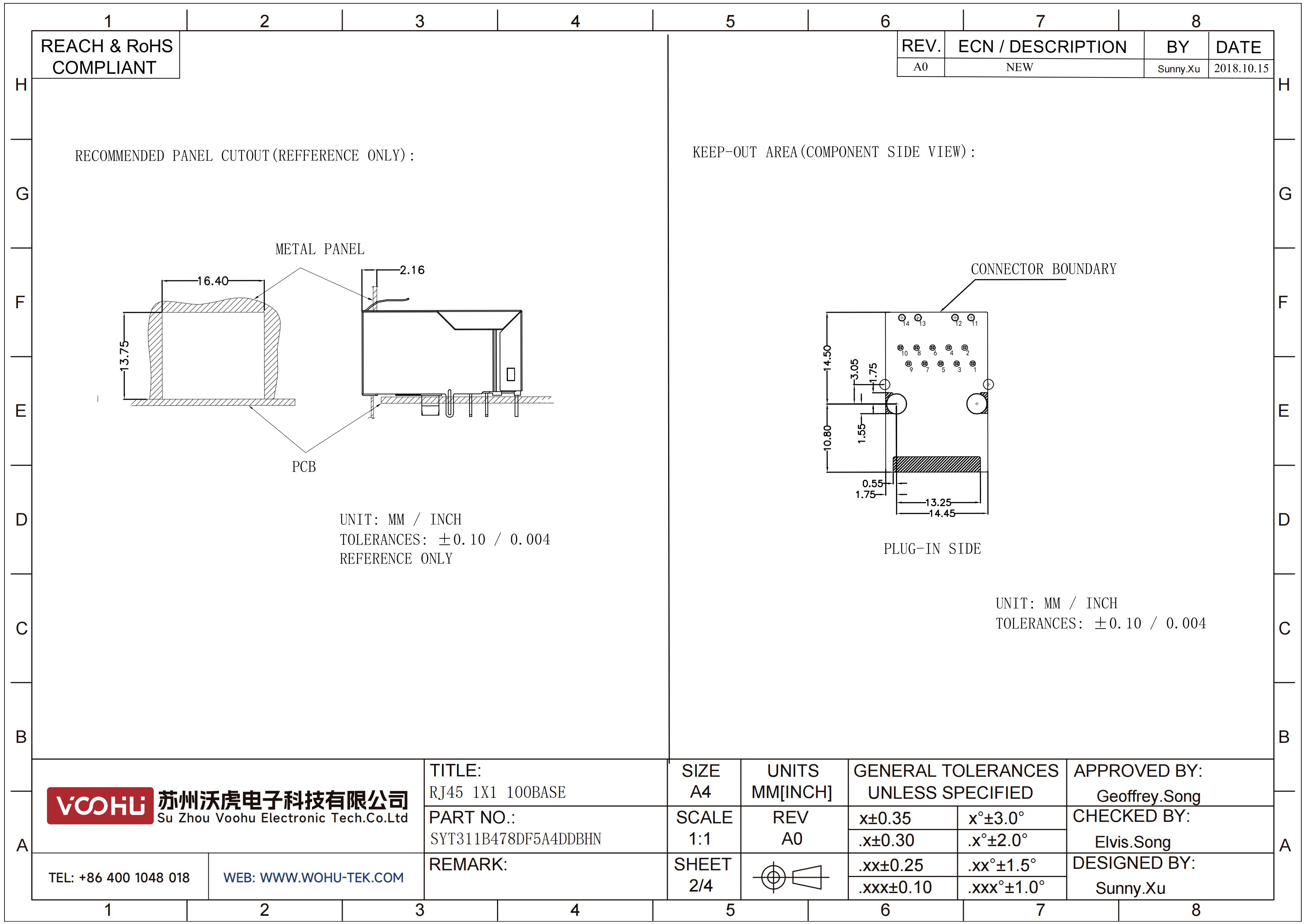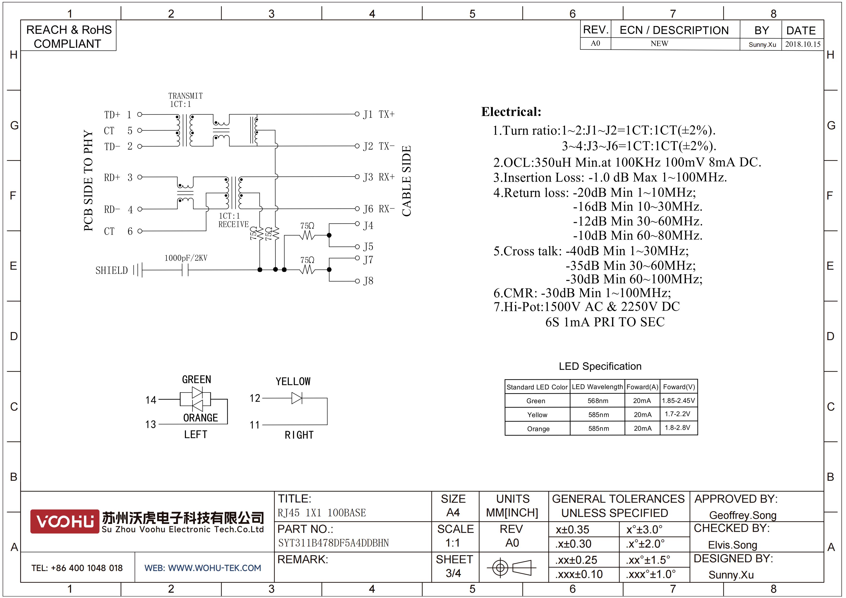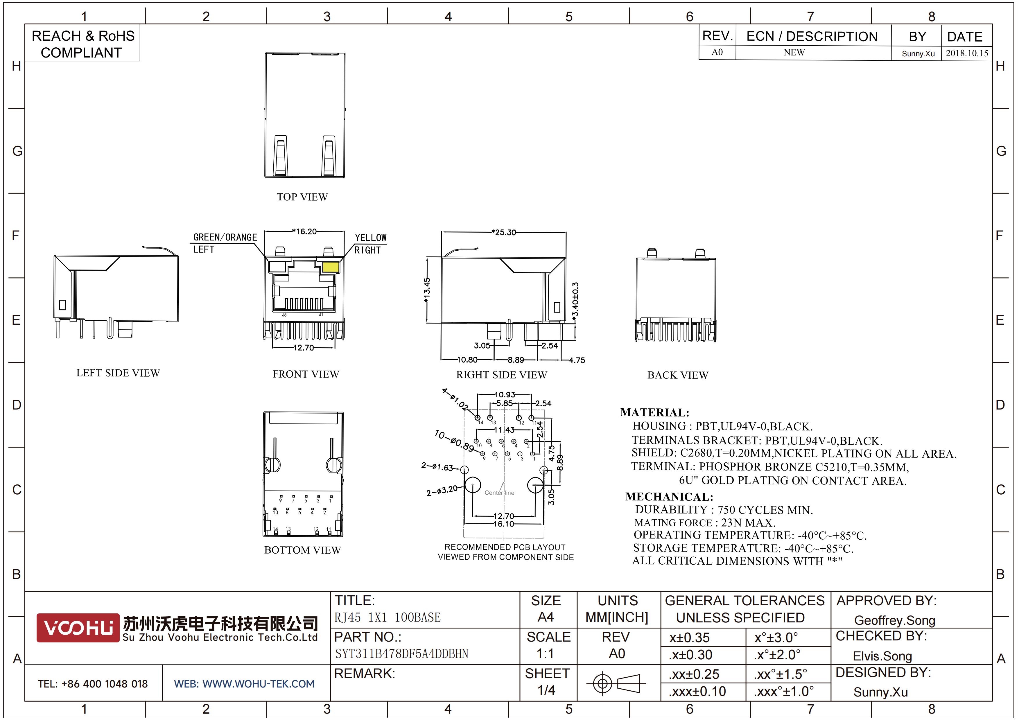 SYT311B478DF5A4DDBHN 90° side insertion 1*1 Tab UP 100BASE LED GO/Y DIP RJ45