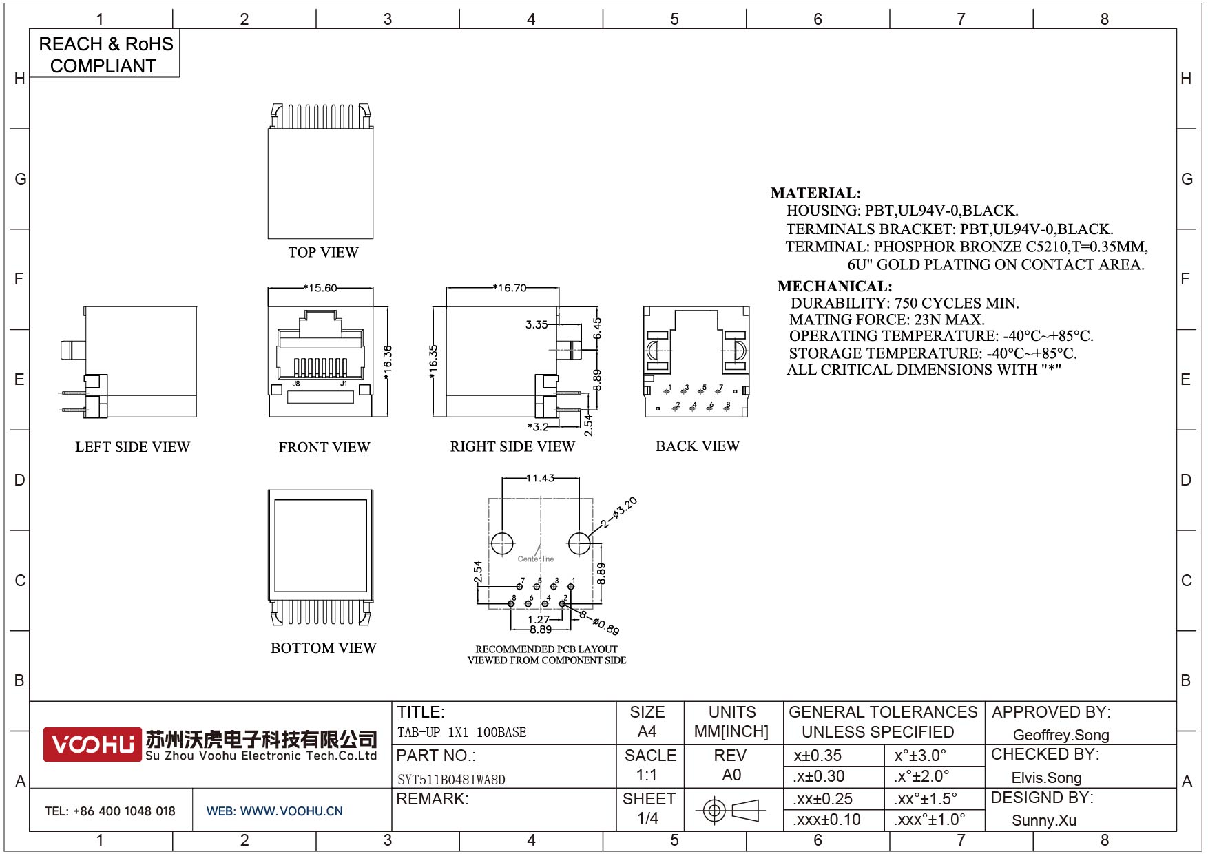 SYT511B048IWA8D 180° vertical 1*1 Tab UP 10/100M NO LED DIP RJ45