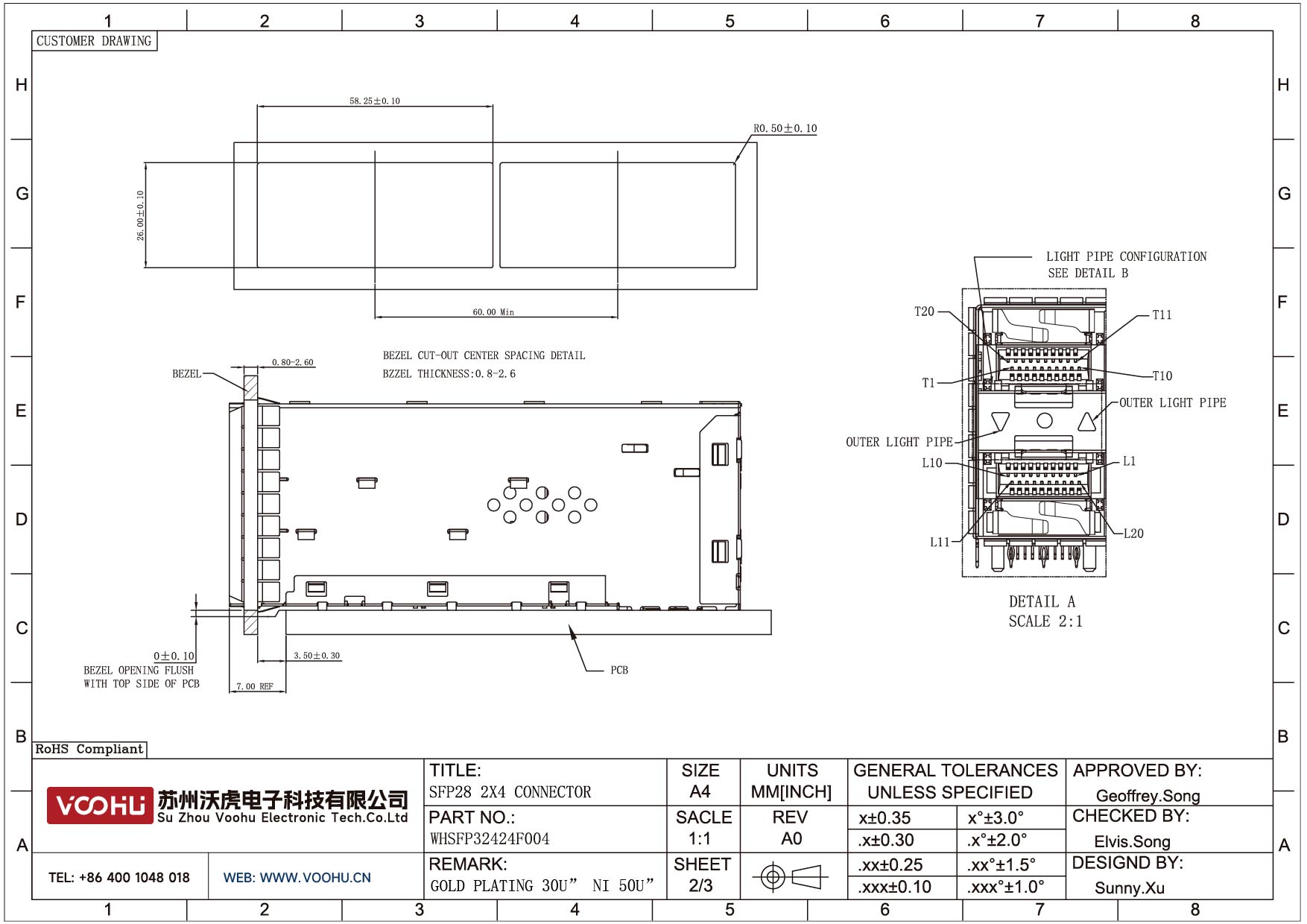 WHSFP06228F020  SFP 2×8 5G Cage+Connector Connector Gold Plated30U Ni 30U Fiber Optic cages