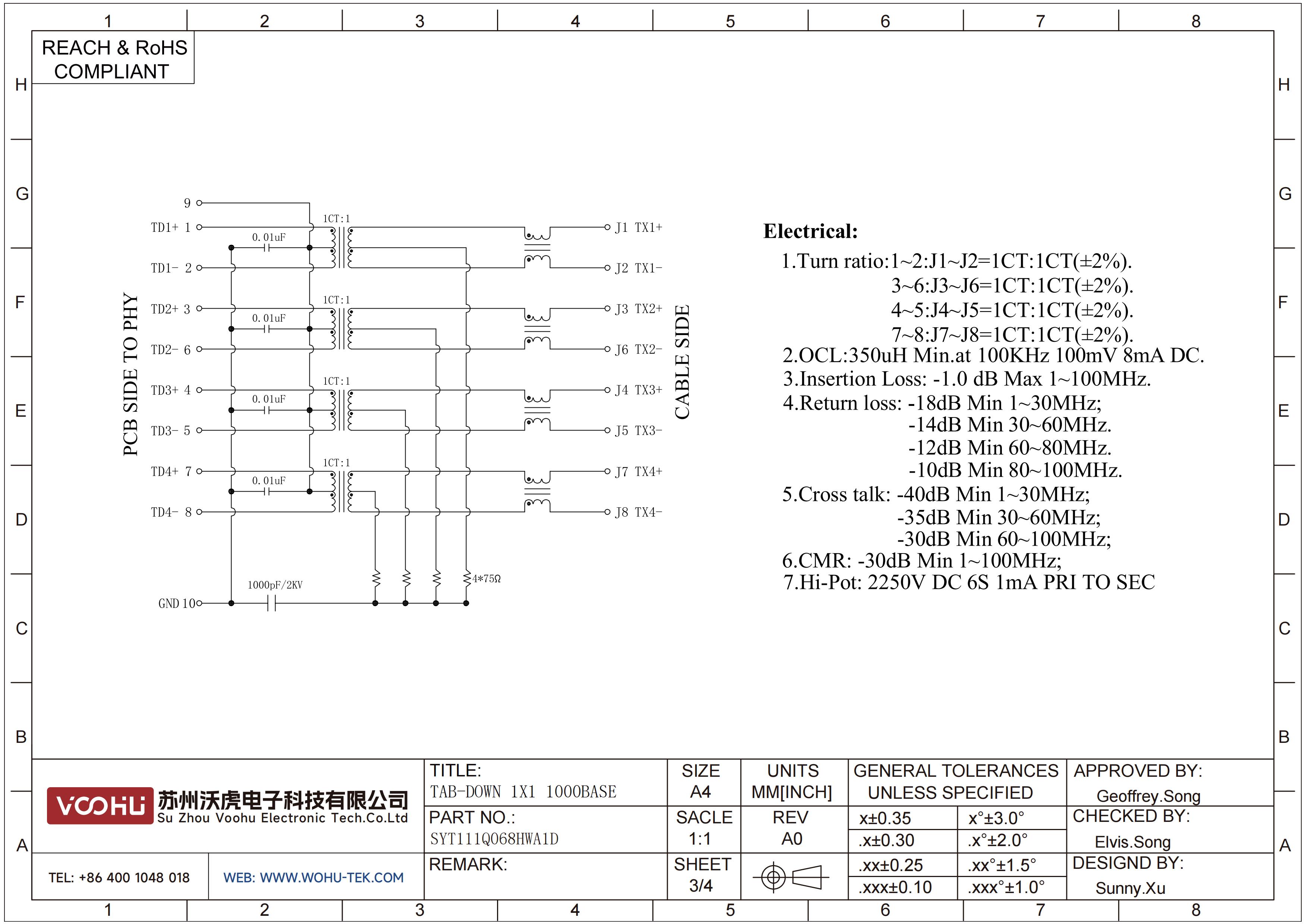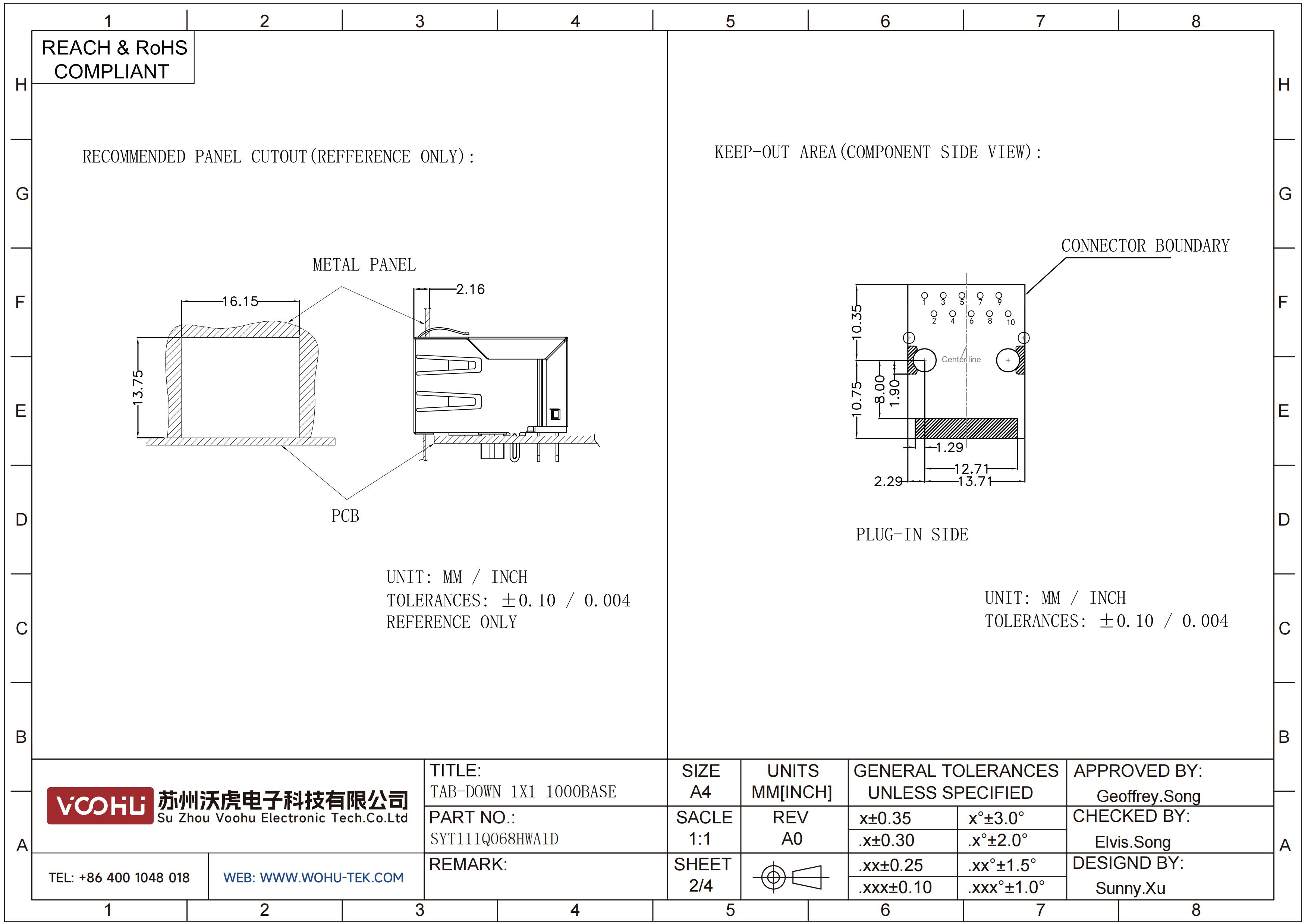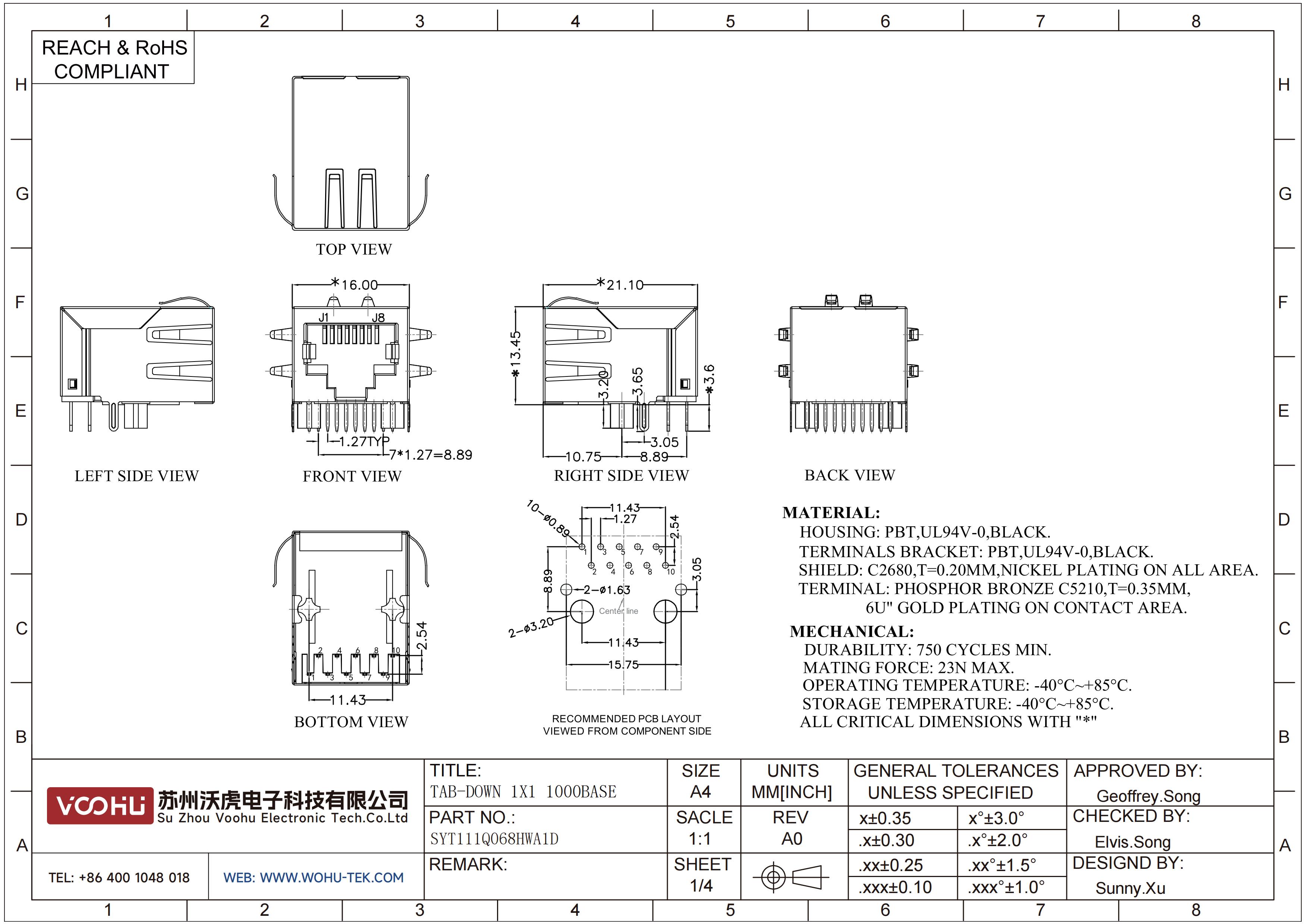 SYT111Q068HWA1D 90° side insertion 1*1 Tab Down G/Y 100/1000M DIP RJ45
