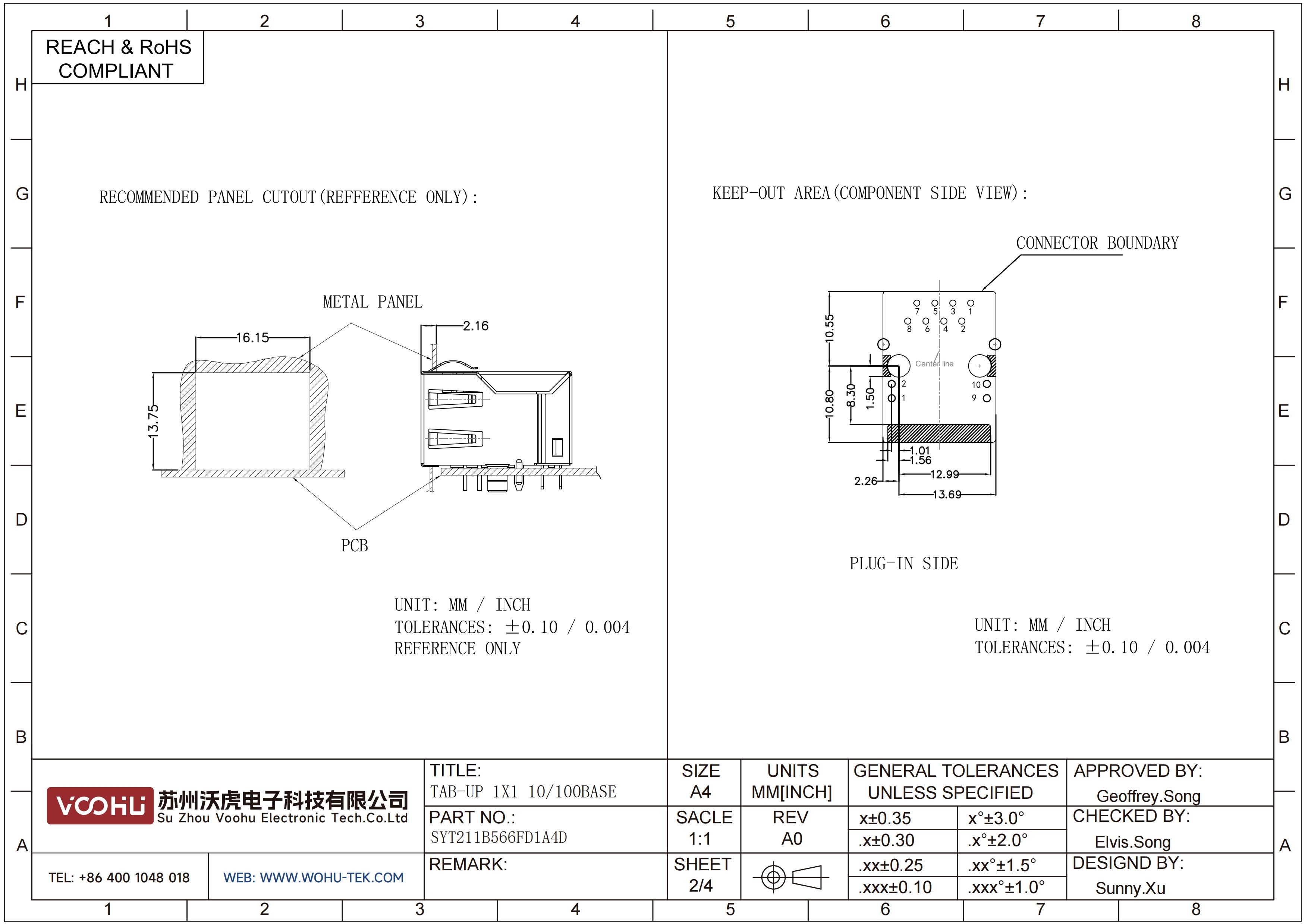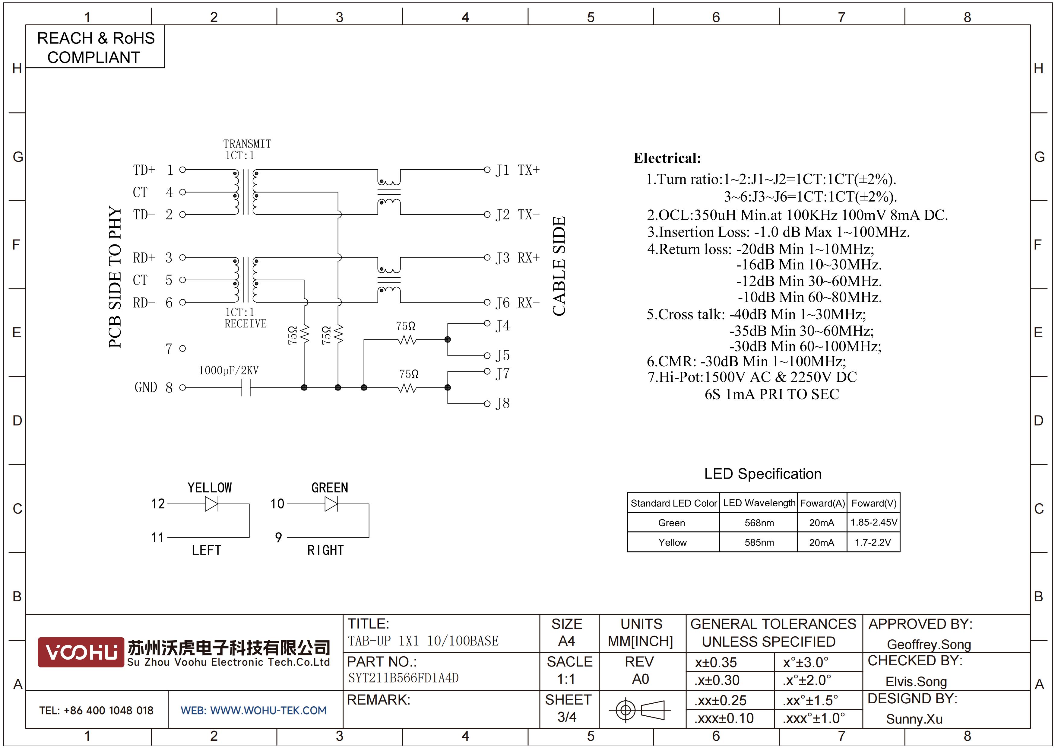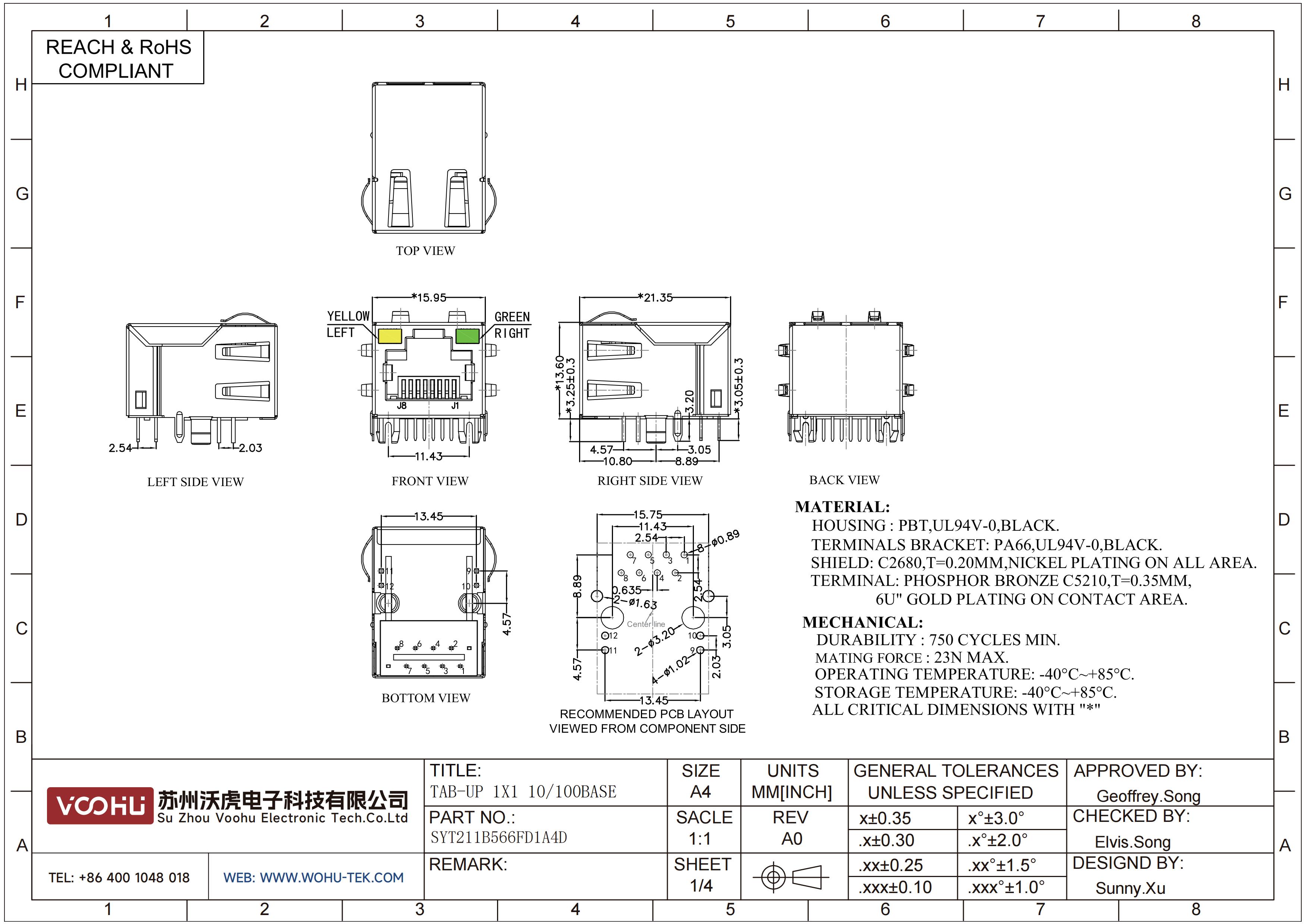 SYT211B566FD1A4D 90° side insertion 1*1 Tab UP Y/G 10/100M DIP RJ45