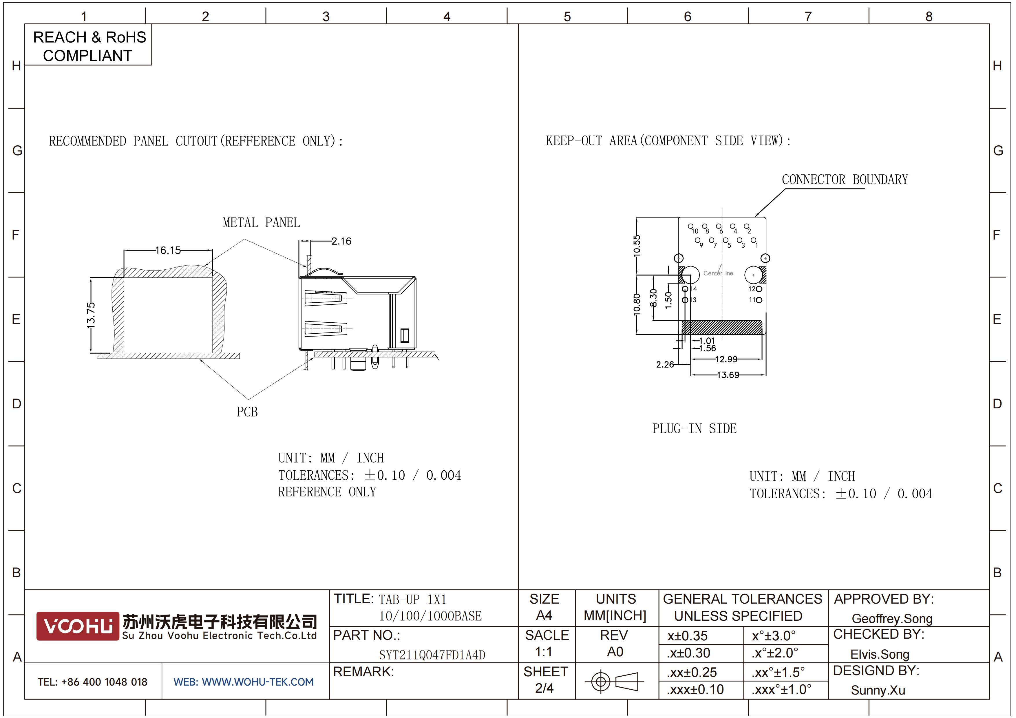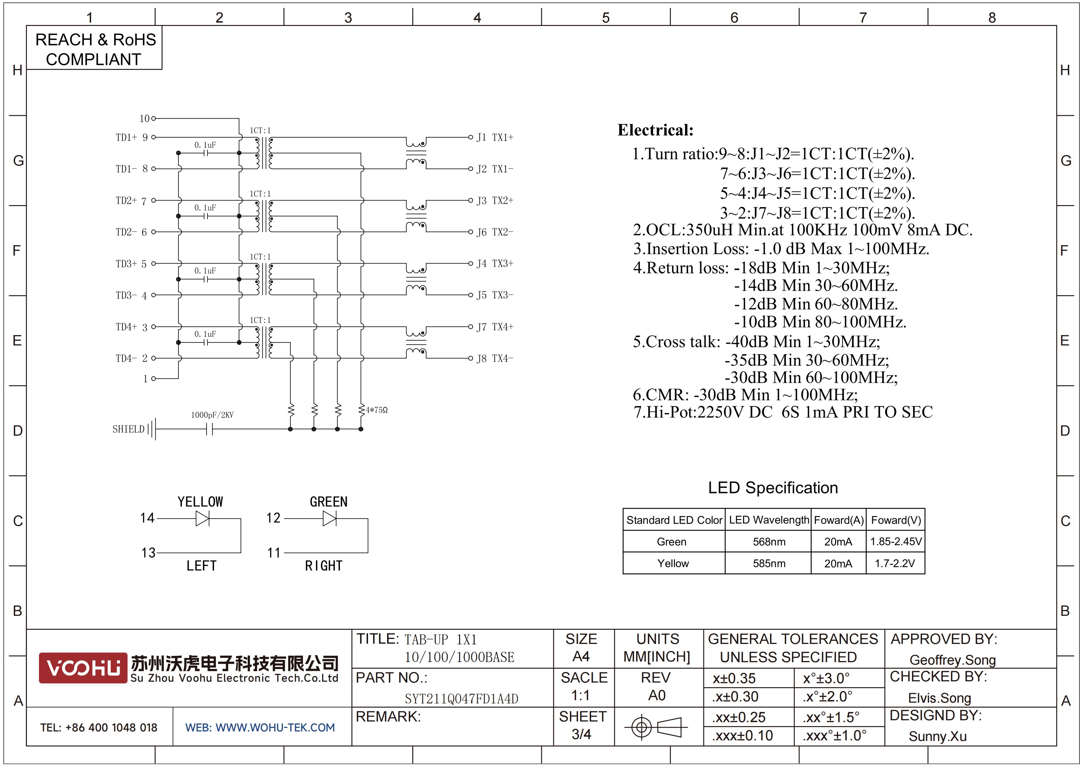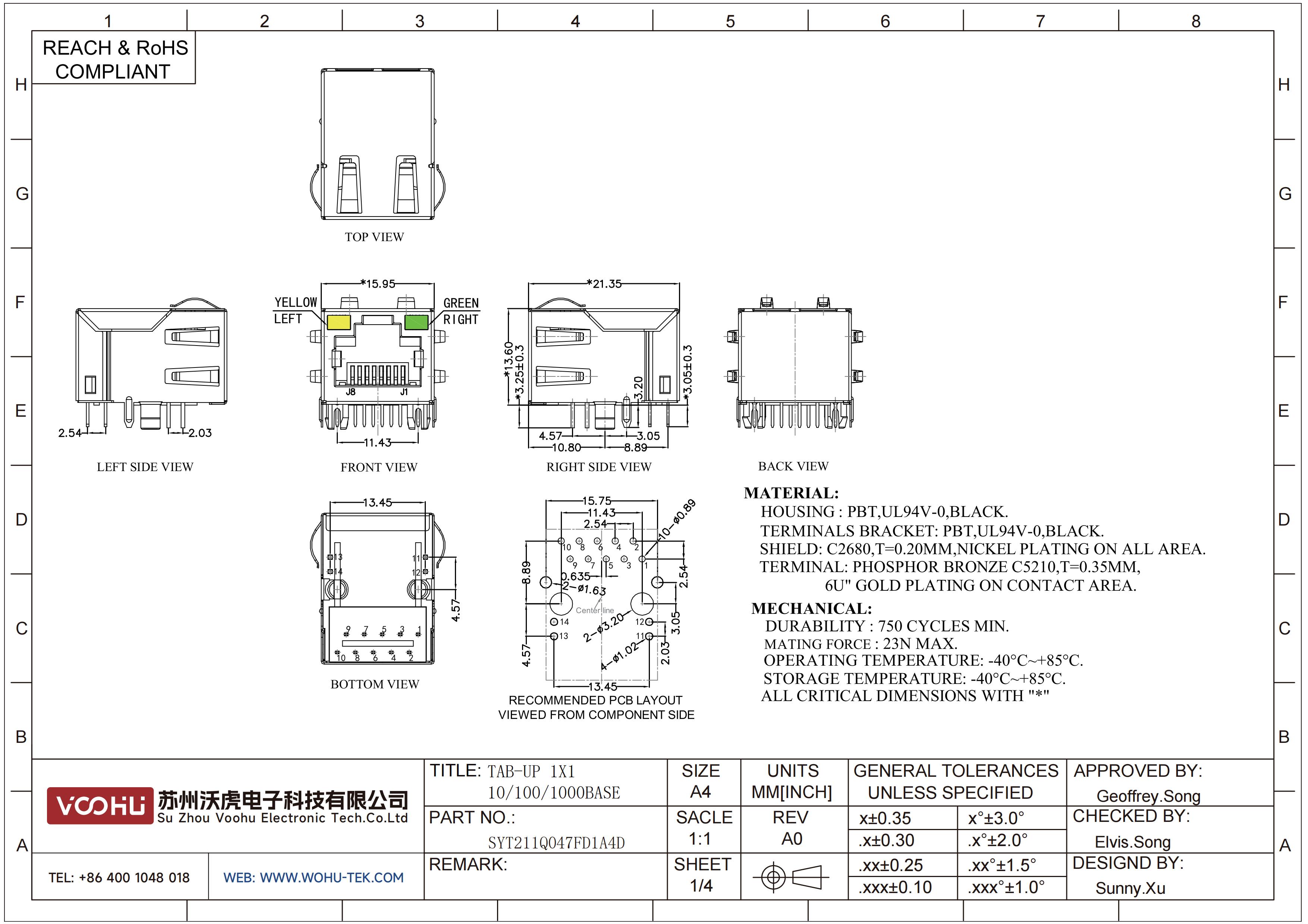 SYT211Q047FD1A4D 90° 1*1 Tab Up 100/1000BASE LED Y/G DIP RJ45