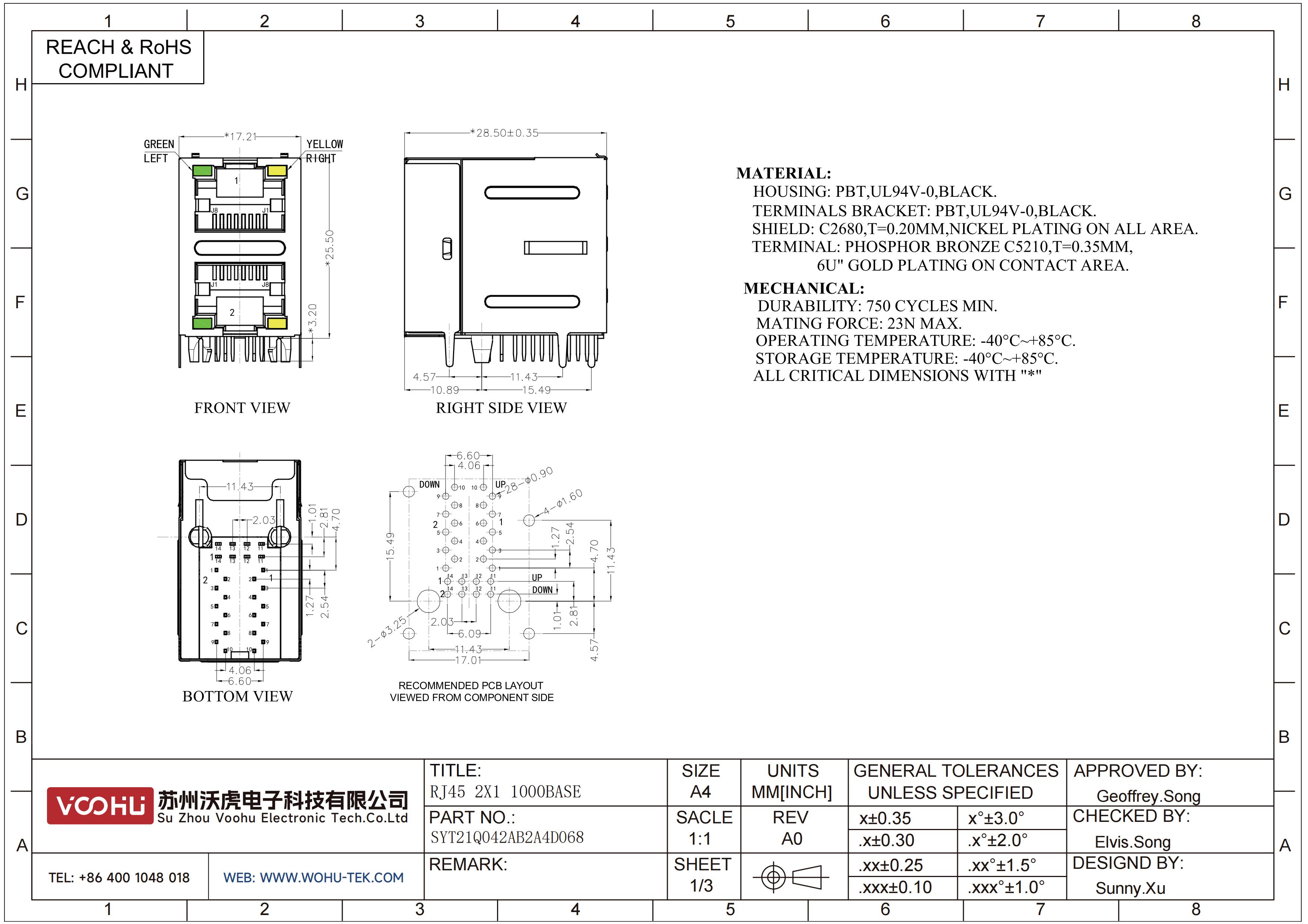 SYT21Q042AB2A4D068 90° 2*1 Tab-Up/Down 100/1000BASE LED G/Y DIP RJ45