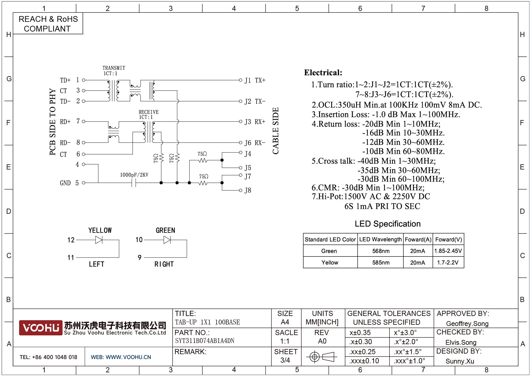 SYT511Q070AB2A8D 180° vertikal 1*1 Tab UP 100/1000M LED G/Y DIP RJ45