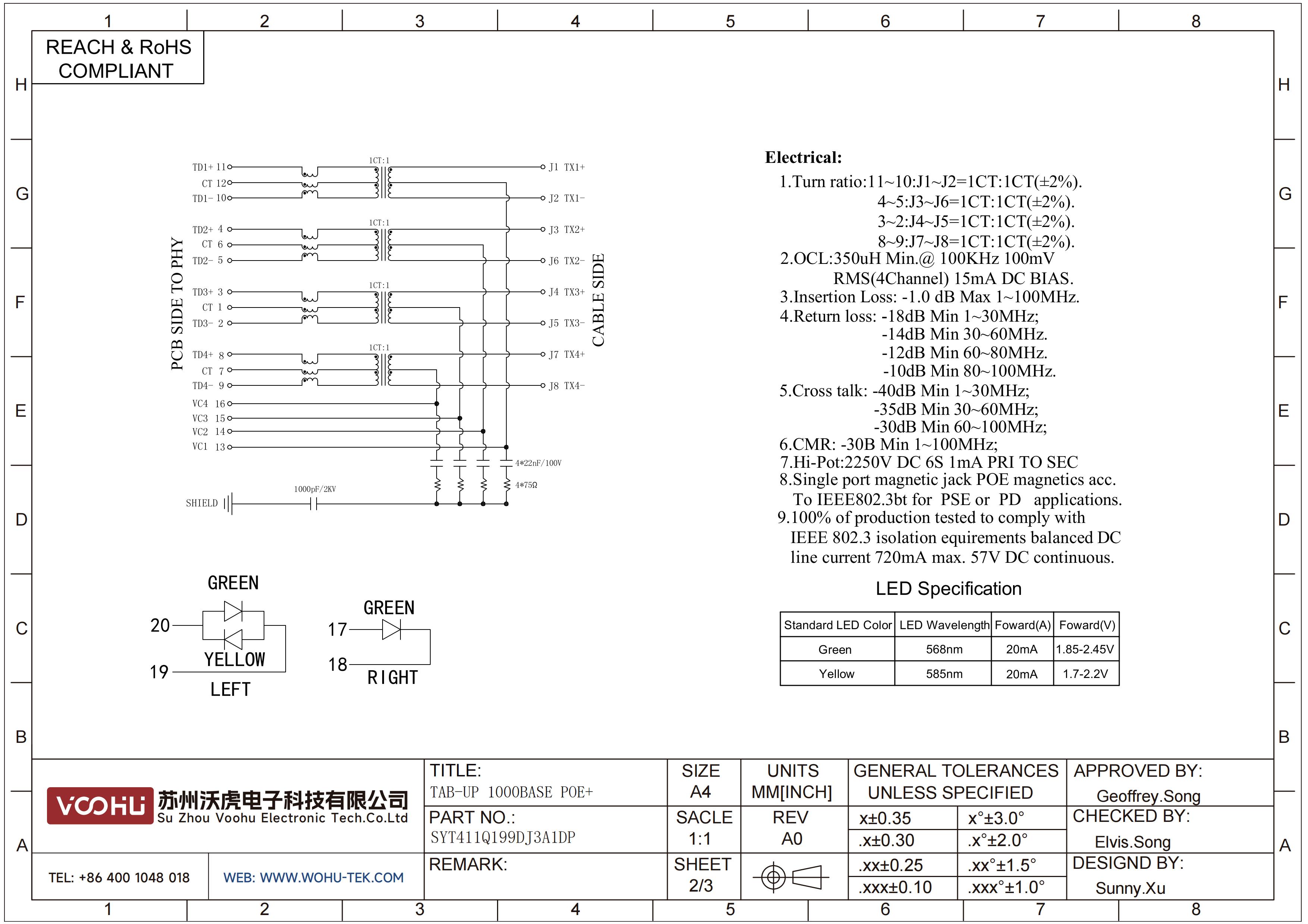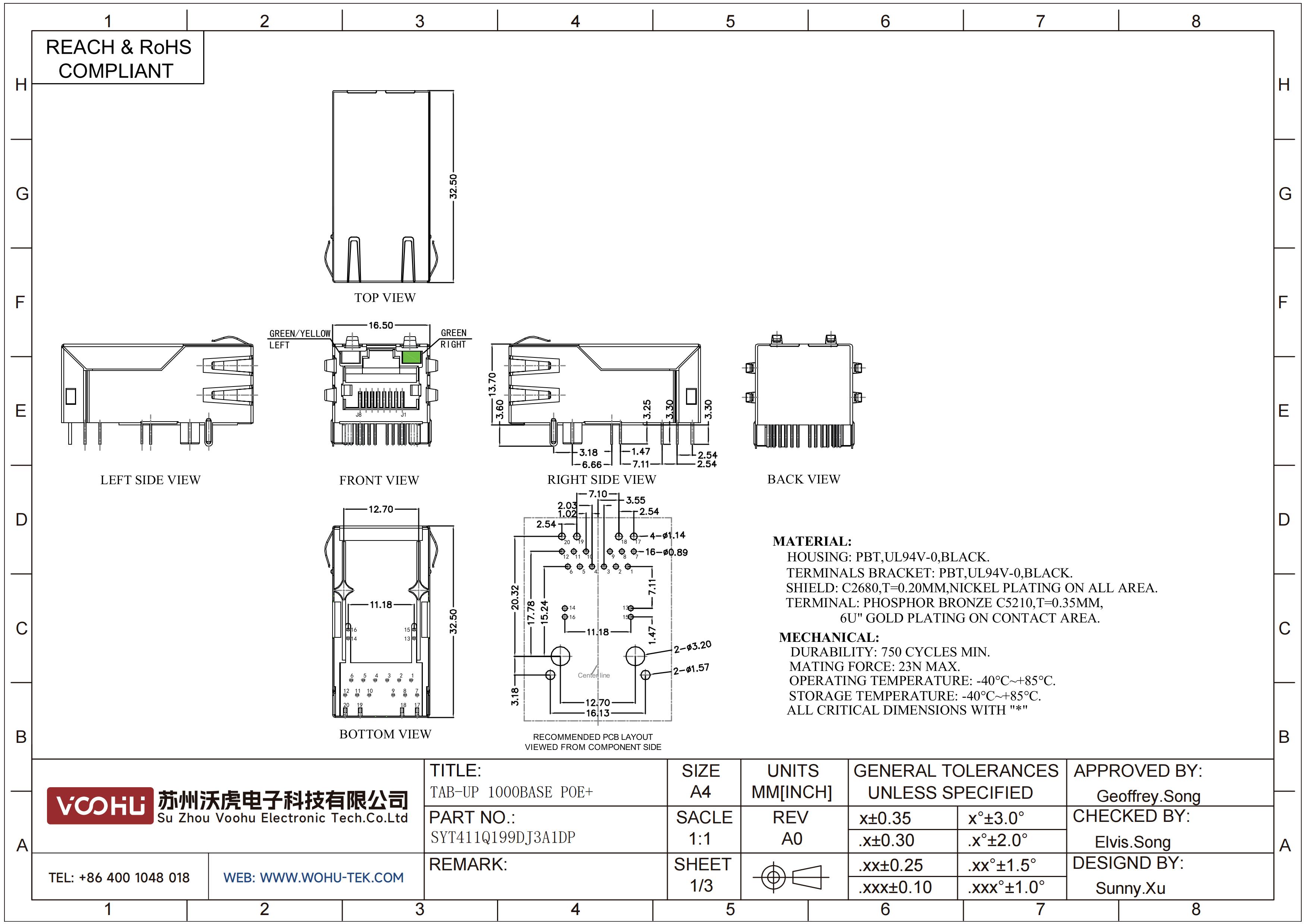 SYT411Q199DJ3A1DP 90° 1*1 Tab Up 100/1000BASE POE 720mA LED GY/G DIP RJ45