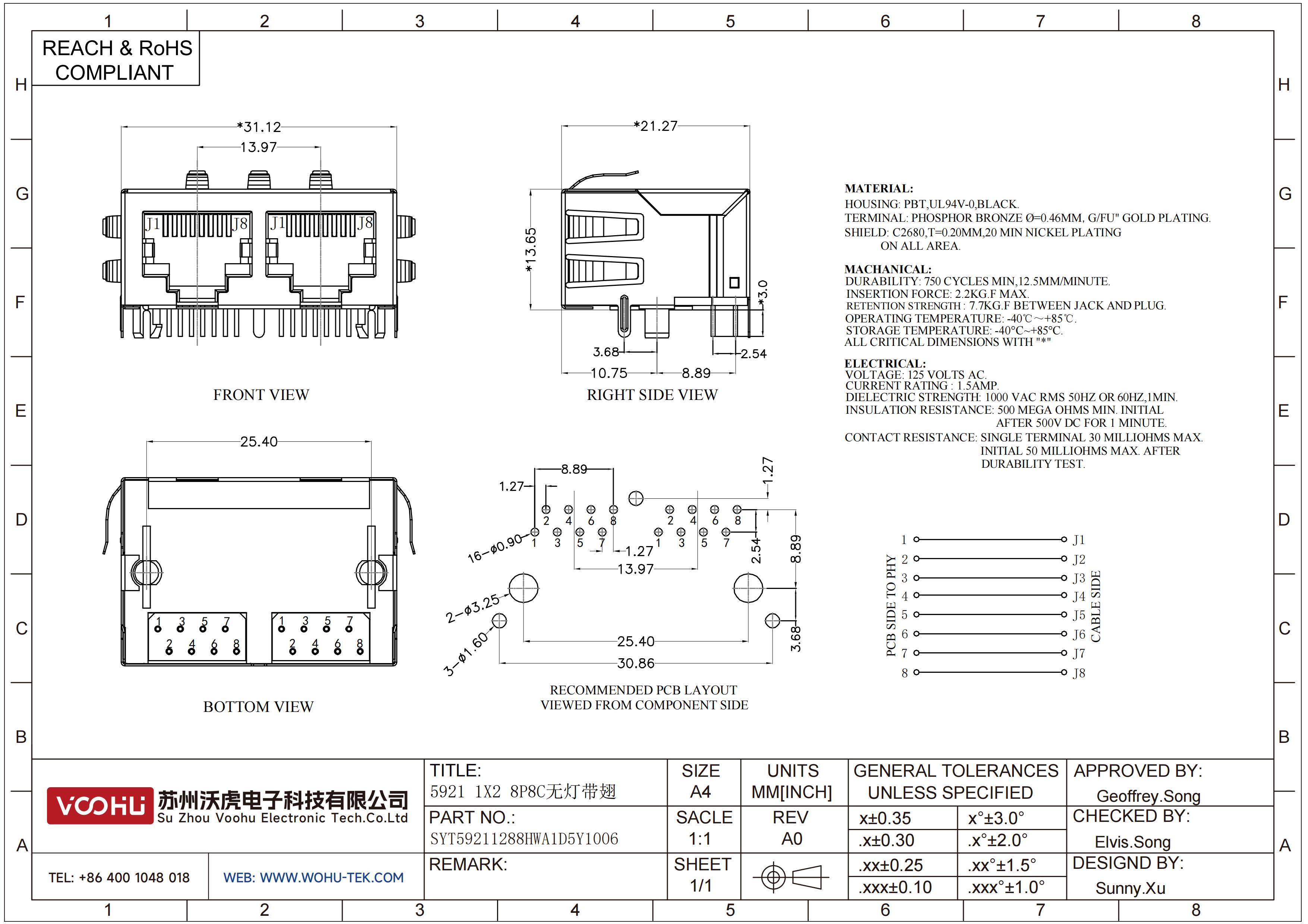 SYT59211288HWA1D5Y1006 90° side insertion 1*2 Tab Down Shield Tabs DIP RJ45