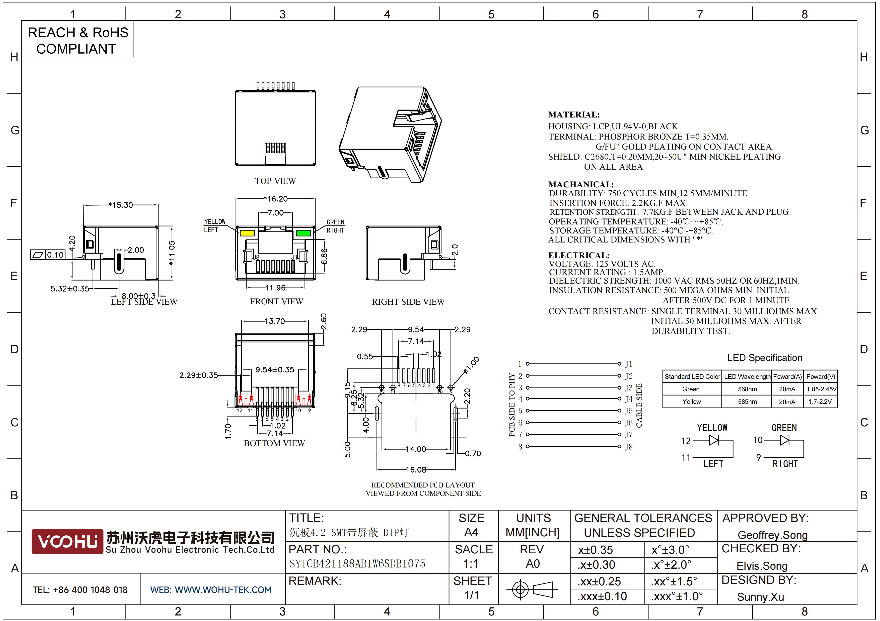 SYTCB421188AB1W6SDB1075 90° side insertion 1*1 Tab UP LED Y/G SMT RJ45 Offset Connector