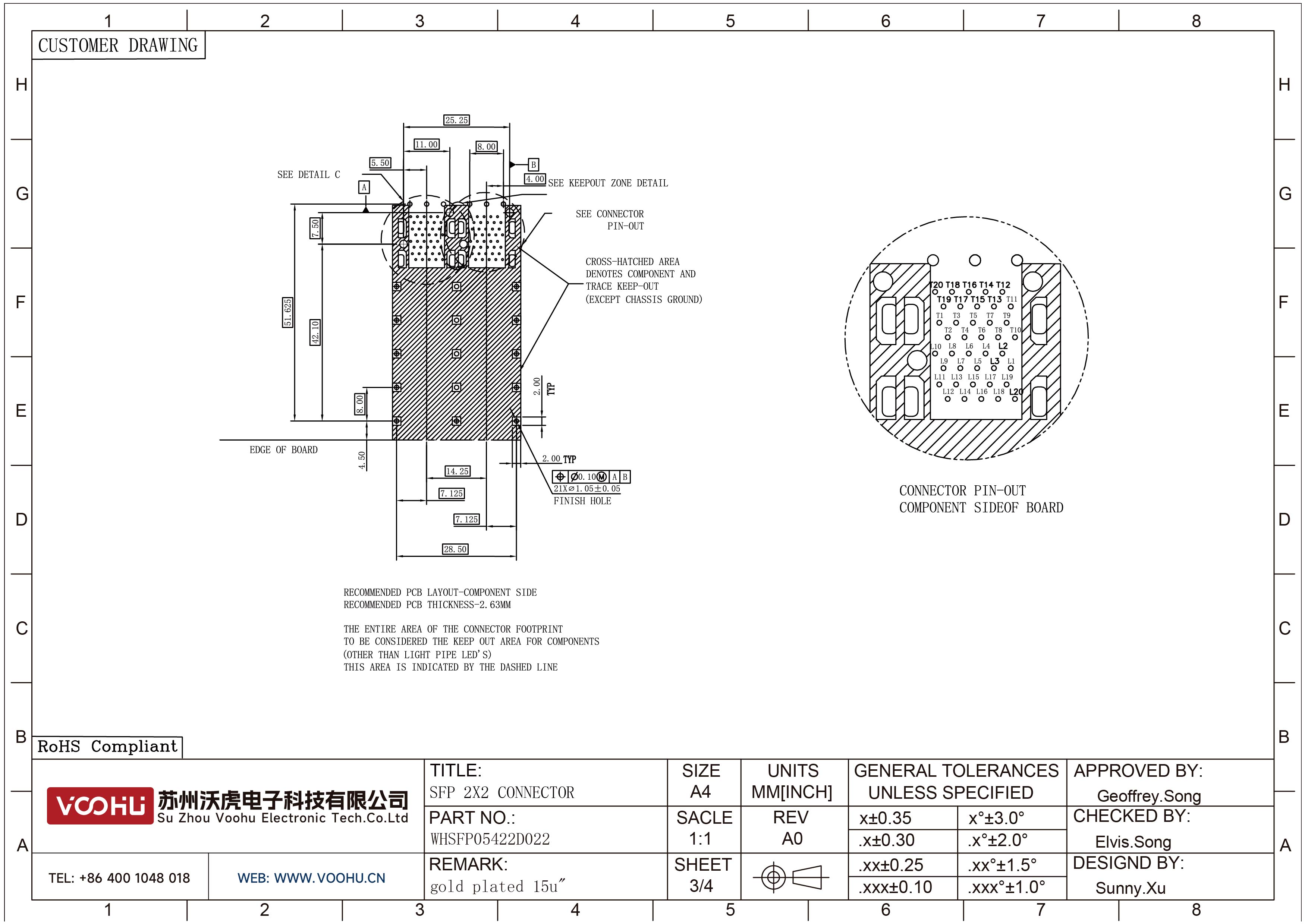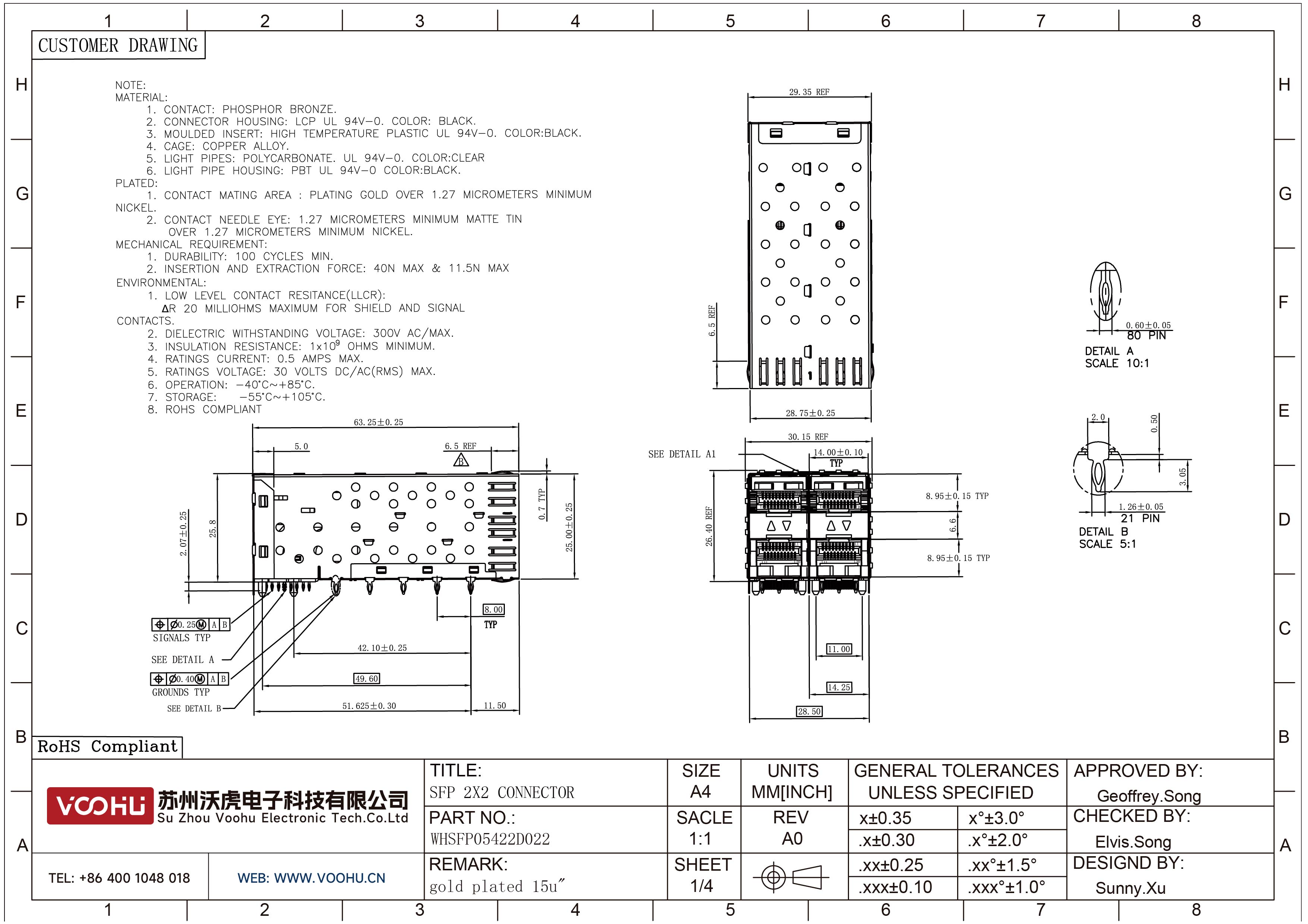 WHSFP05422D022 SFP 2×2 5G Cage+Connector Connector Gold Plated15U Fiber Optic cages