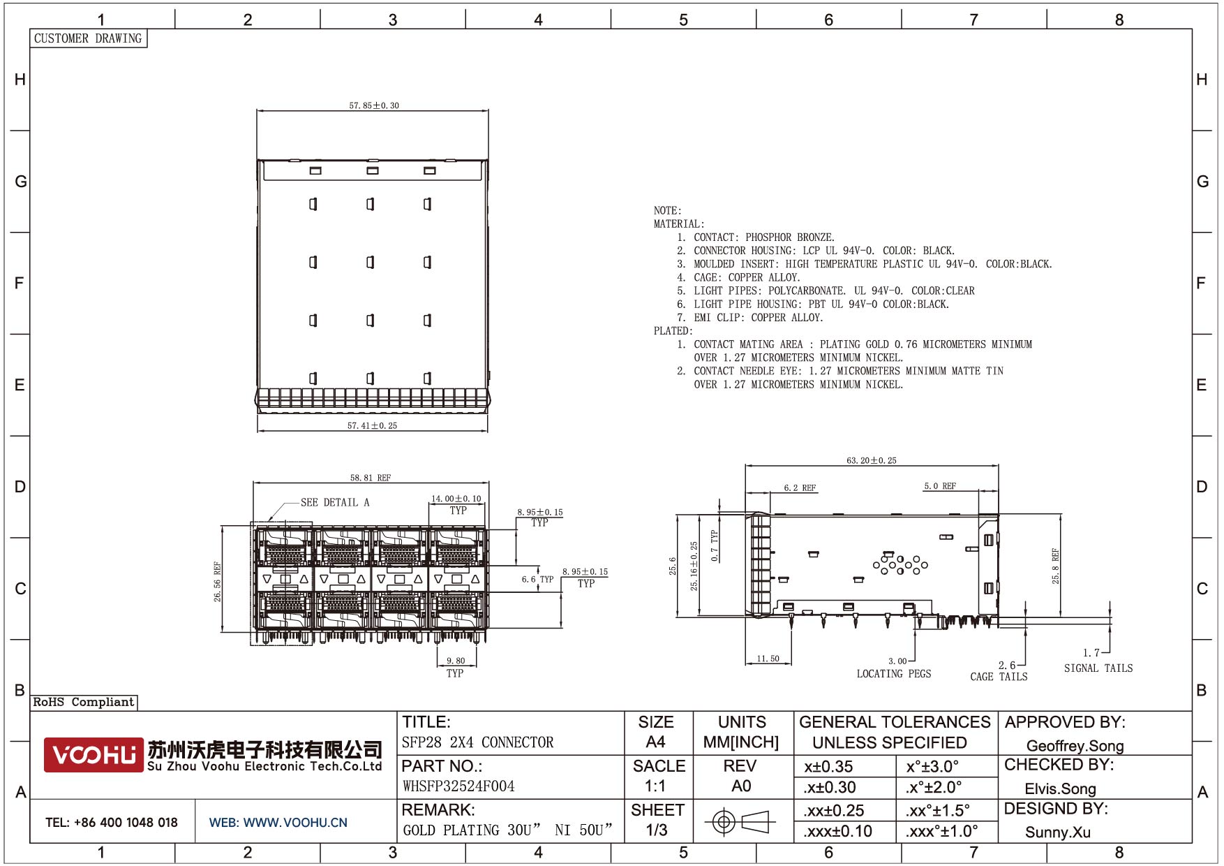 WHSFP06026F044 SFP 2×6 5G Cage+Connector Connector Gold Plated30U Ni 30U Fiber Optic cages