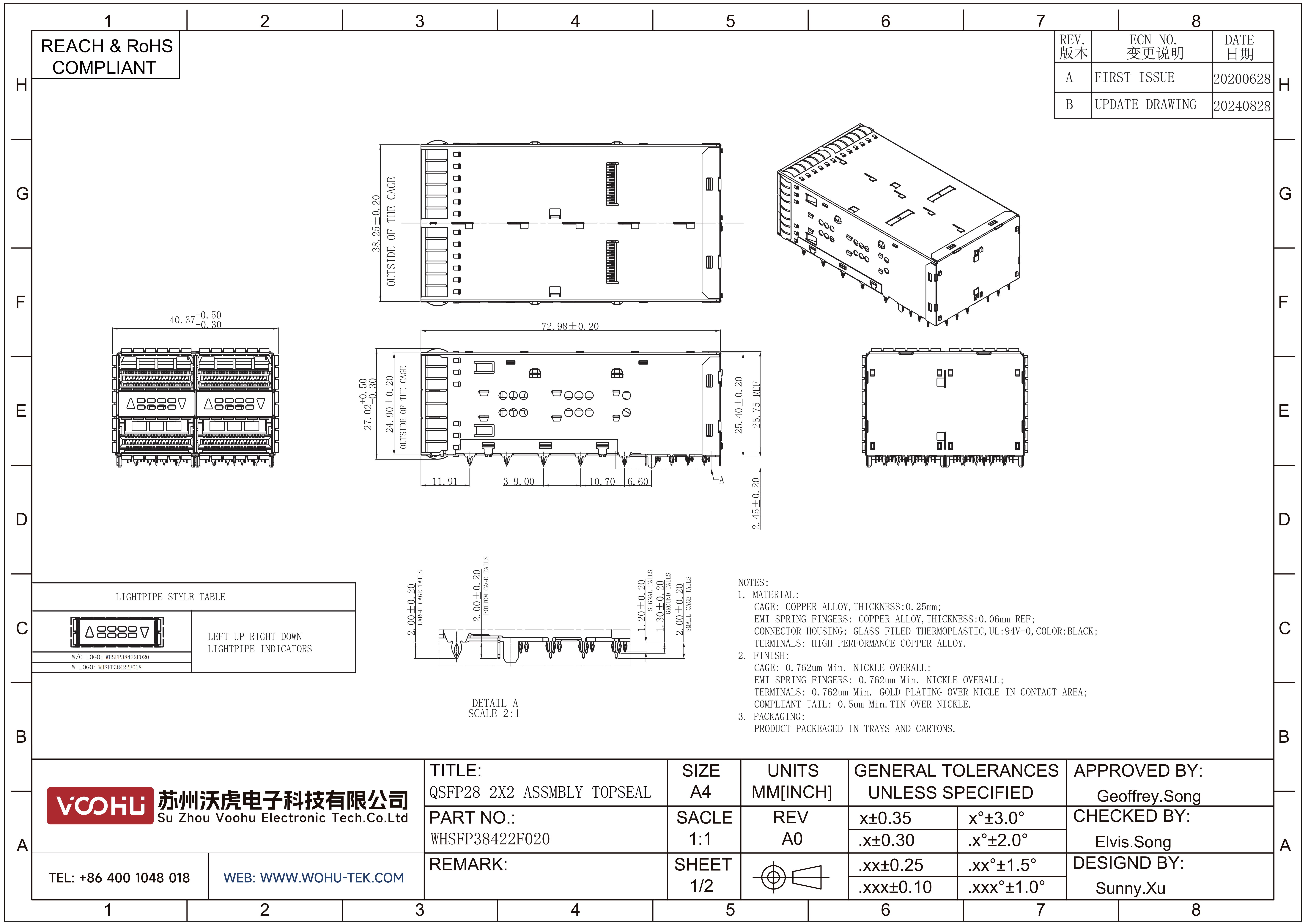 WHSFP38422F020 QSFP28 2X2 ASSMBLY TOPSEAL SMD