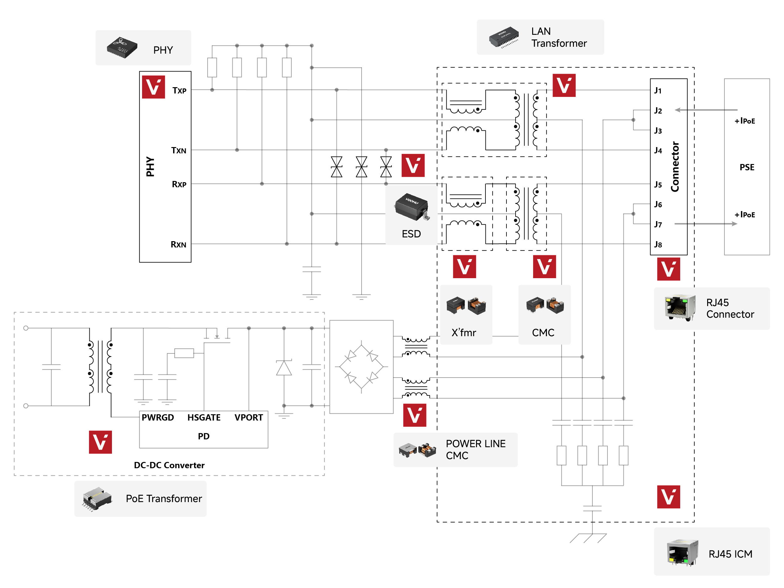 Sicherheitsüberwachungsgeräte, die sich durch hohe Effizienz, kompakte Größe und niedrige Kosten auszeichnen, haben die Entwicklung von Ethernet Power over Ethernet (PoE) erforderlich gemacht, um diesen vielfältigen Anforderungen gerecht zu werden. Diese Art von Sicherheitsausrüstung wird häufig in großen Szenarien wie Flughäfen, Bahnhöfen und Einkaufszentren eingesetzt.Voohu Electronic Technology bietet PoE-Systemlösungen, die die Bereitstellung von Komponenten auf Systemebene, kundenspezifische Entwicklungsunterstützung und umfassende technische Fähigkeiten umfassen. Ergänzt werden diese Lösungen durch Evaluierungsdemos und umfassende Testberichte, wodurch der gesamte Prozess vom Design bis zur Massenproduktion beschleunigt wird.1. Ethernet-Kommunikationsinfrastruktur