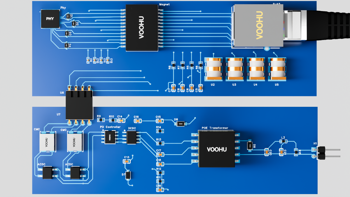Sicherheitsüberwachungsgeräte, die sich durch hohe Effizienz, kompakte Größe und niedrige Kosten auszeichnen, haben die Entwicklung von Ethernet Power over Ethernet (PoE) erforderlich gemacht, um diesen vielfältigen Anforderungen gerecht zu werden. Diese Art von Sicherheitsausrüstung wird häufig in großen Szenarien wie Flughäfen, Bahnhöfen und Einkaufszentren eingesetzt.Voohu Electronic Technology bietet PoE-Systemlösungen, die die Bereitstellung von Komponenten auf Systemebene, kundenspezifische Entwicklungsunterstützung und umfassende technische Fähigkeiten umfassen. Ergänzt werden diese Lösungen durch Evaluierungsdemos und umfassende Testberichte, wodurch der gesamte Prozess vom Design bis zur Massenproduktion beschleunigt wird.1. Ethernet-Kommunikationsinfrastruktur