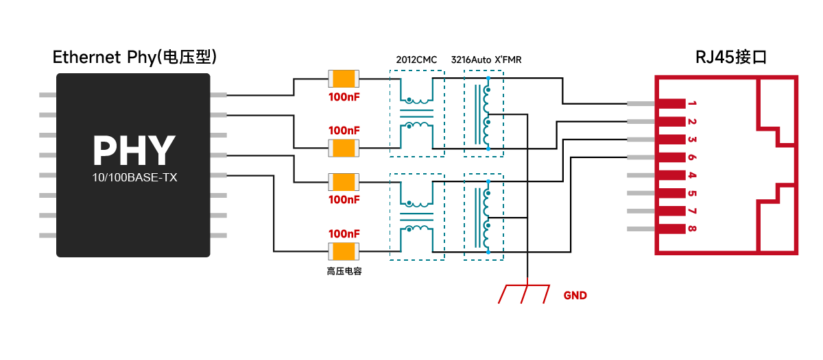 Chip Lan (kapazitiv) überträgt Signale durch kapazitive Gleichstromisolierung und filtert Gleichstromstörungen präzise, um eine effektive Übertragung von Impulssignalen sicherzustellen. Die Impedanzanpassung wird durch eine Ersatzschaltung aus Kondensatoren, Gleichtaktinduktivitäten und Spartransformatoren erreicht, die eine flexible Anpassung an unterschiedliche Impedanzanforderungen ermöglicht. Die Rauschunterdrückung basiert auf Gleichtaktinduktivitäten oder Spartransformatoren und erzielt den gleichen Rauschunterdrückungseffekt wie Chip-LAN-Transformatoren (induktiv) und herkömmliche Netzwerktransformatoren. Da kein zusätzlicher Transformator erforderlich ist, ist das Schaltungsdesign einfacher und eignet sich daher für Szenarien, in denen DC-Isolation und flexible Impedanzanpassung von entscheidender Bedeutung sind.