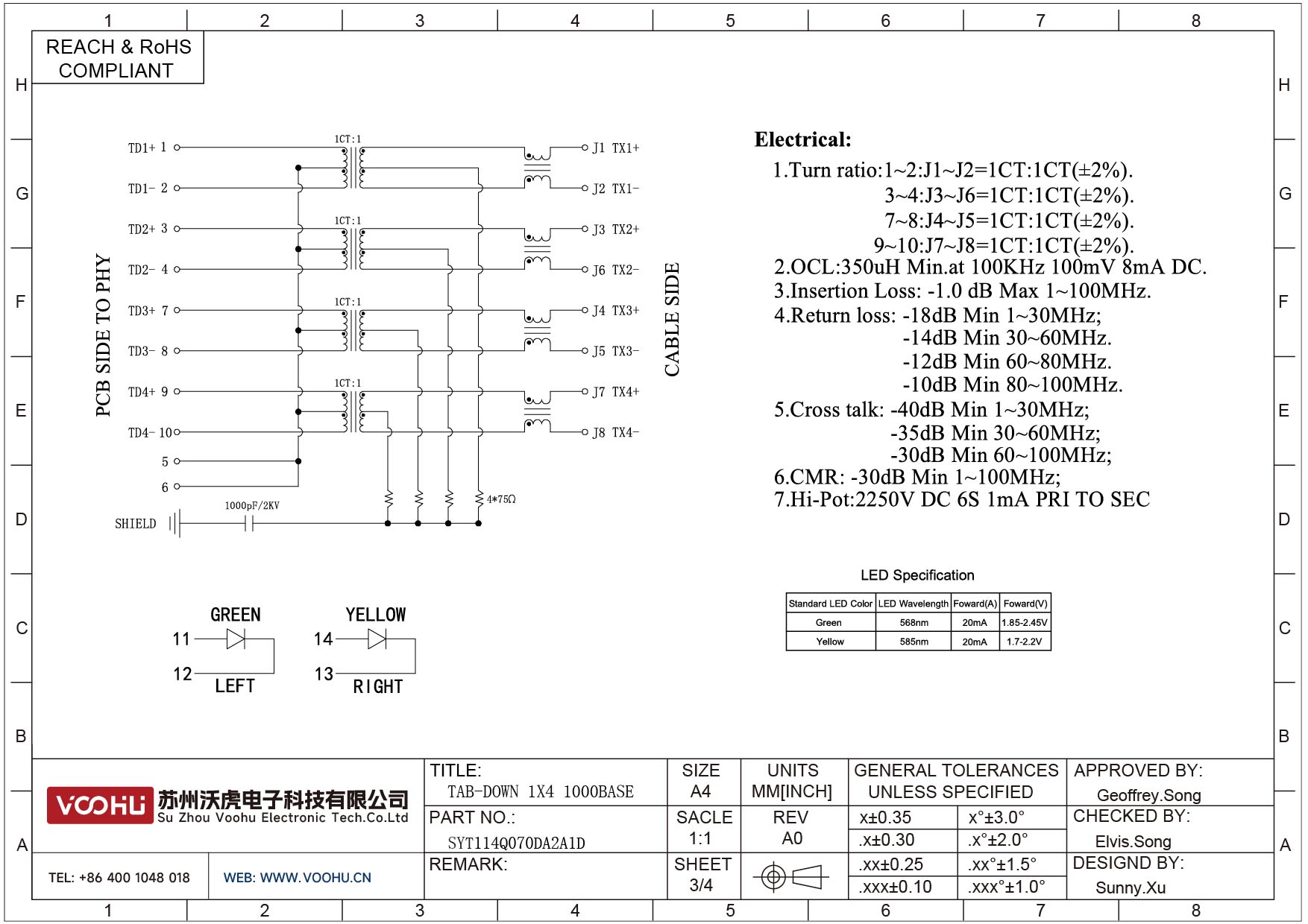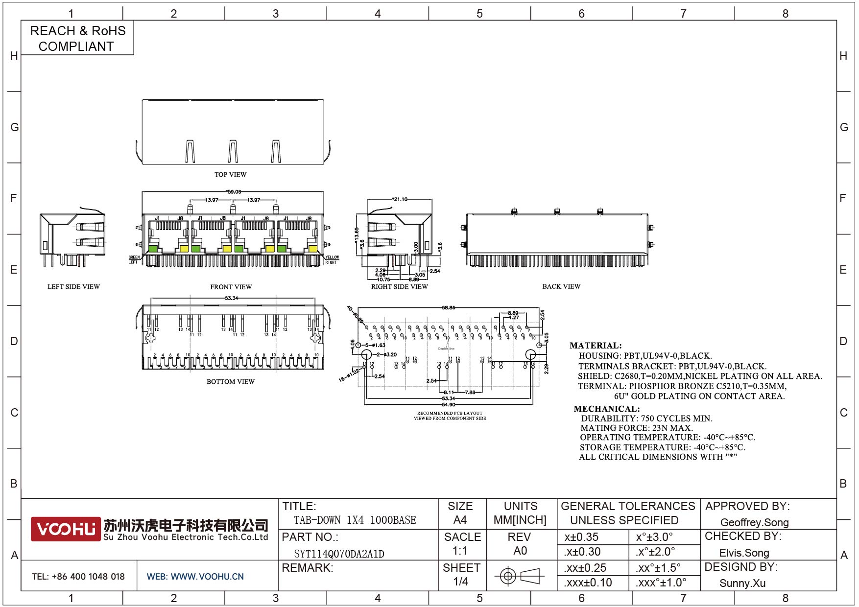 SYT114Q070DA2A1D 90° side insertion 1*4 Tab Down 100/1000M LED G/Y DIP RJ45