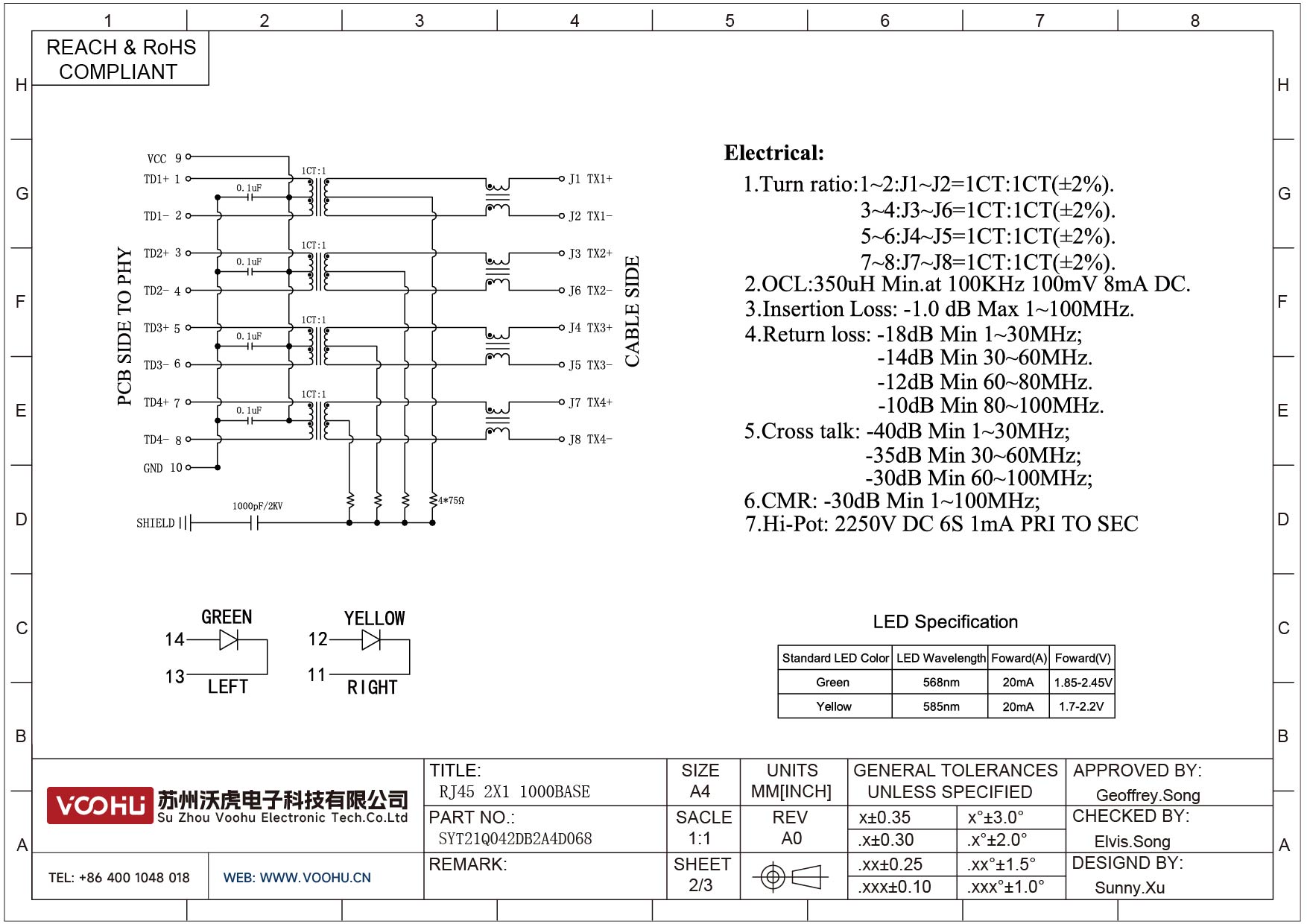 SYT21Q042DB2A4D068 90° side insertion 2*1 Tab UP/Down 100/1000M LED G/Y DIP RJ45