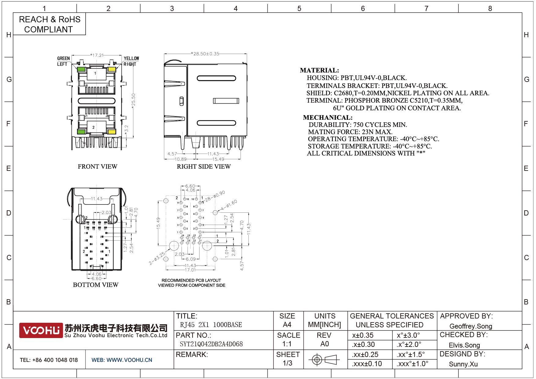SYT114Q070DA2A1D 90° side insertion 1*4 Tab Down 100/1000M LED G/Y DIP RJ45