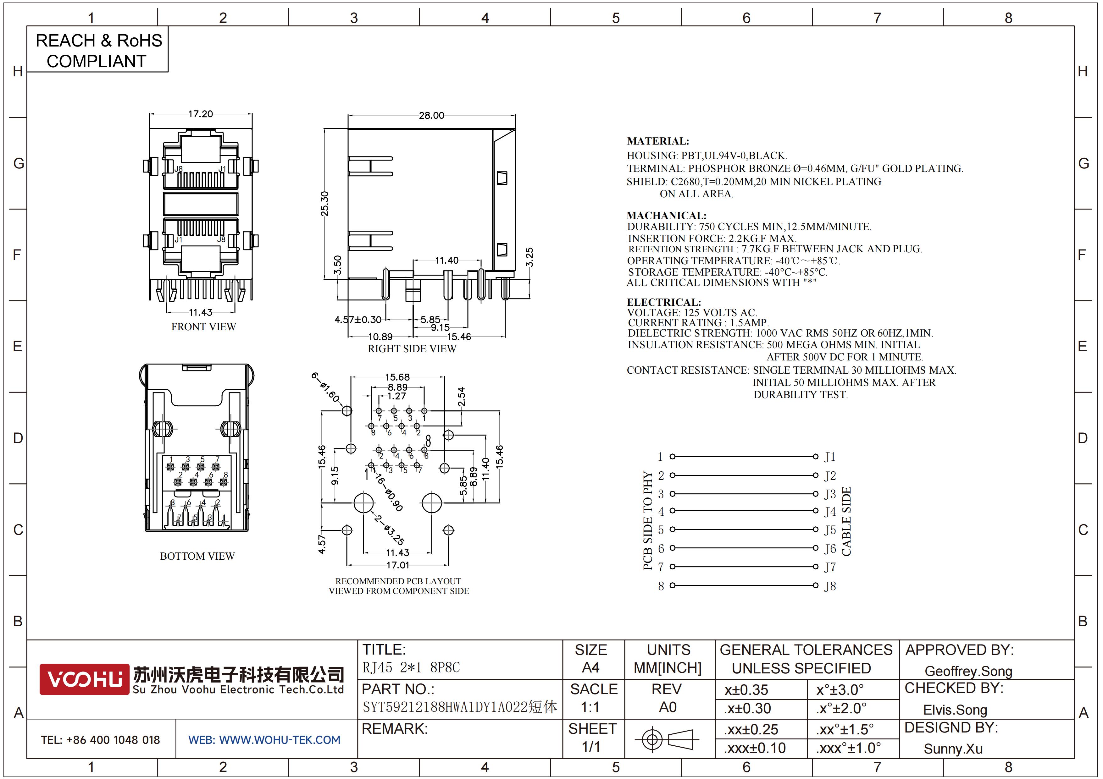 SYT59212188HWA1DY1A022Short body 90° side insertion 2*1 Tab UP/Down NO LED DIP RJ45