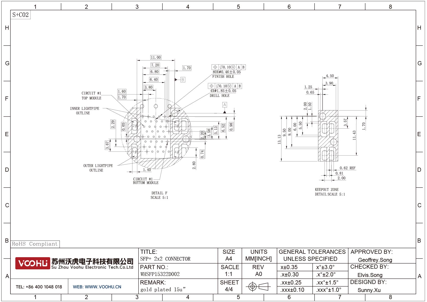 WHSFP15322D002 SFP+ 2×2 10G Press-Fit Cage+Connector Connector Gold Plated15U Fiber Optic cages
