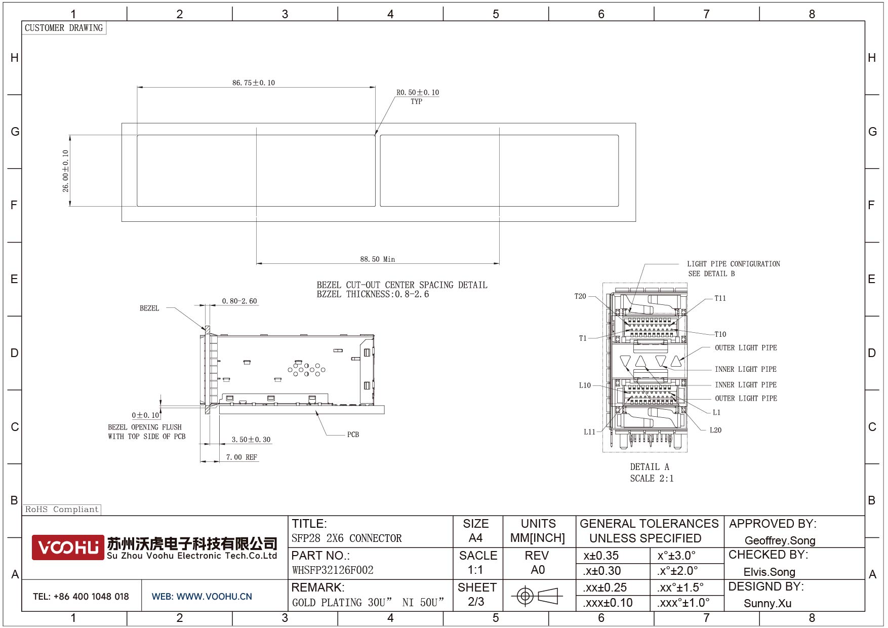 WHSFP15624D009 SFP+ 2×4 10G Press-Fit Cage+Connector Connector Gold Plated15U Fiber Optic cages