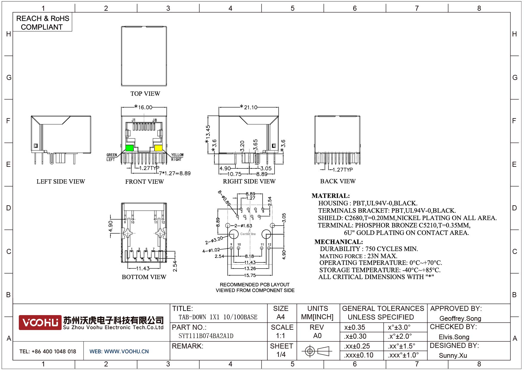 SYT111B074BA2A1D 90° 1*1 Tab Down 10/100M LED G/Y Shield Tabs DIP RJ45