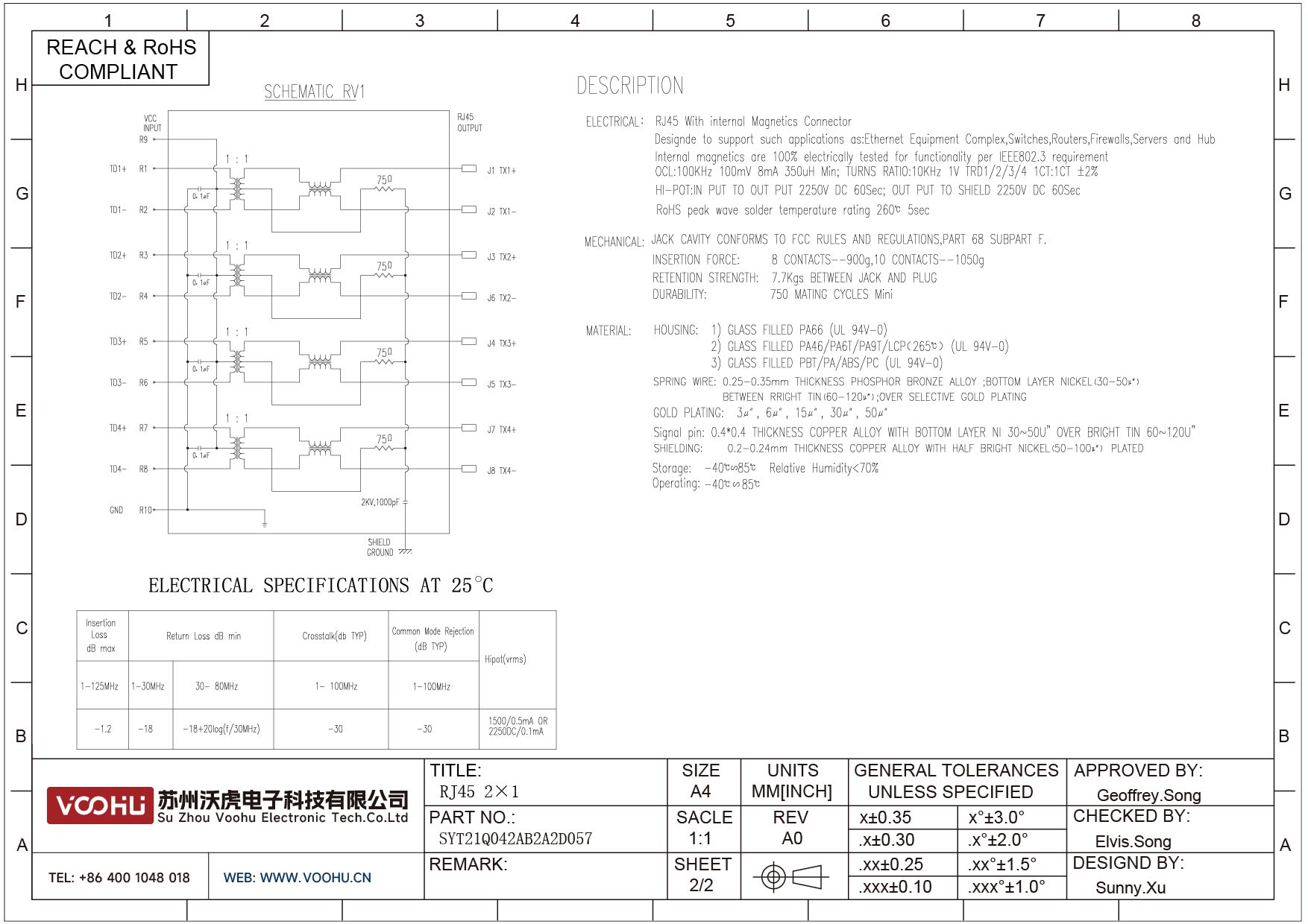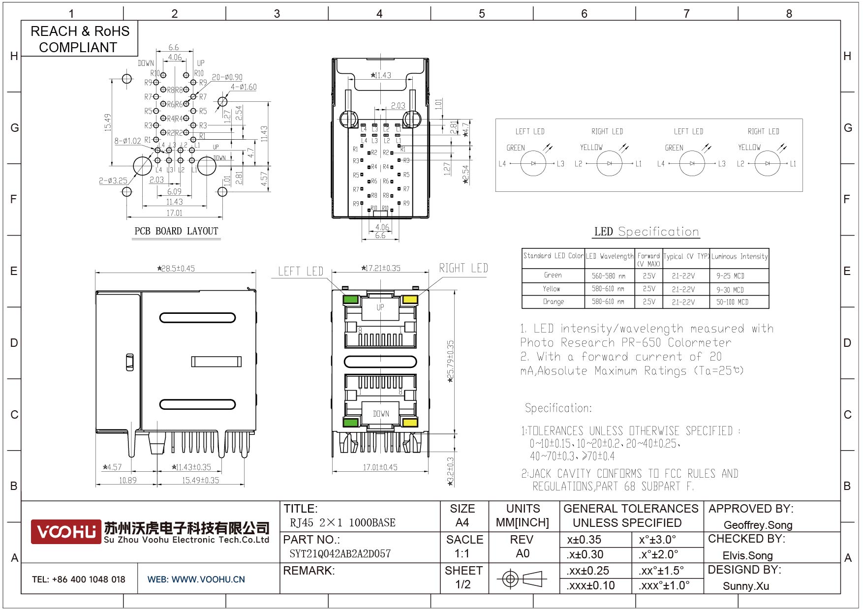 SYT21Q042AB2A2D057 90° side insertion 2*1 Tab UP/Down 100/1000M LED G/Y DIP RJ45