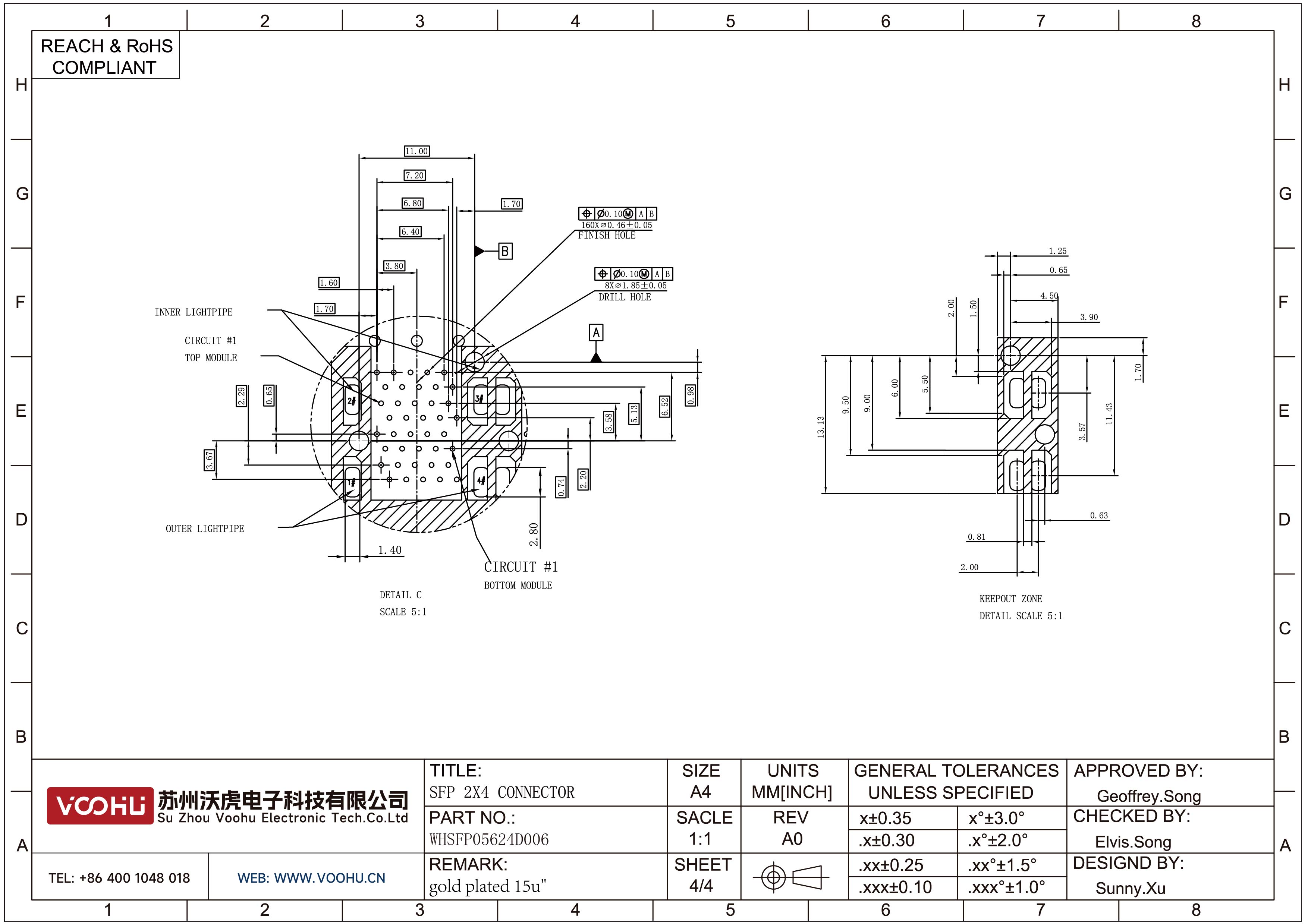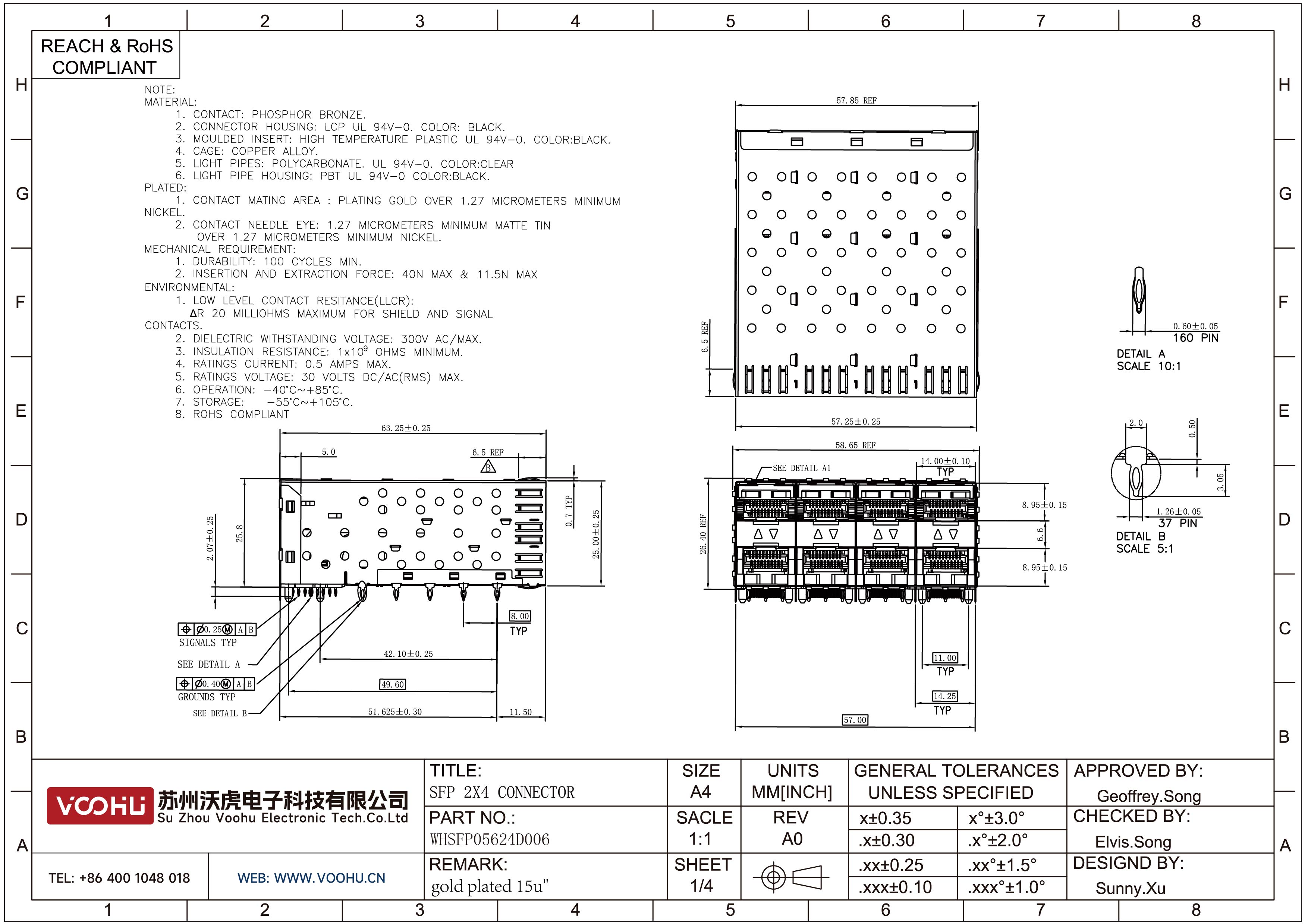 WHSFP05624D006 SFP 2×4 5G Cage+Connector Connector Gold Plated15U Fiber Optic cages