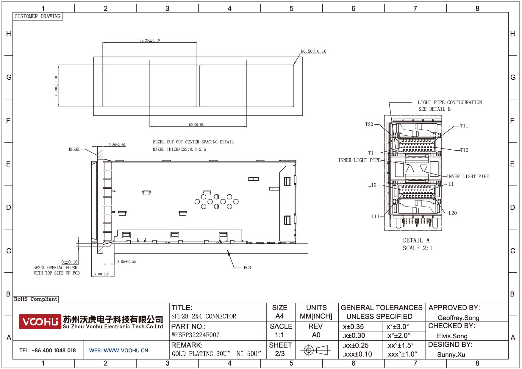 WHSFP06326F001 (Low height) SFP 2×6 5G Cage+Connector Connector Gold Plated30U Ni 50U Fiber Optic cages