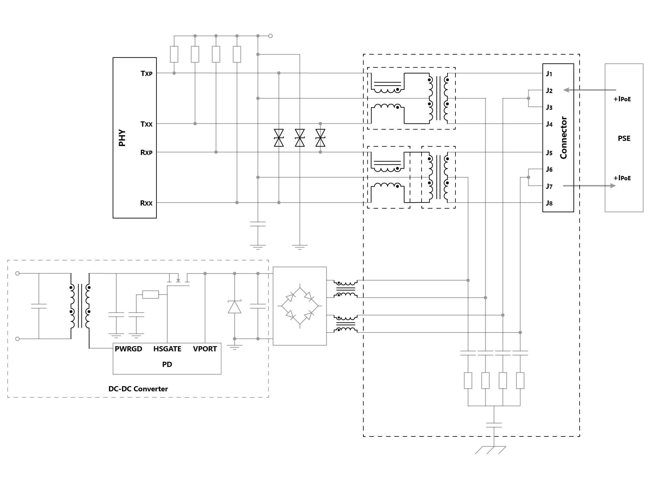 La connexion entre un réseau local (LAN) et Power over Ethernet (PoE) suit la structure illustrée dans la figure. Les signaux Ethernet sont transmis à la puce de couche physique via un câble, tandis que le courant PoE est transmis via le même câble et circule vers le convertisseur DC/DC.