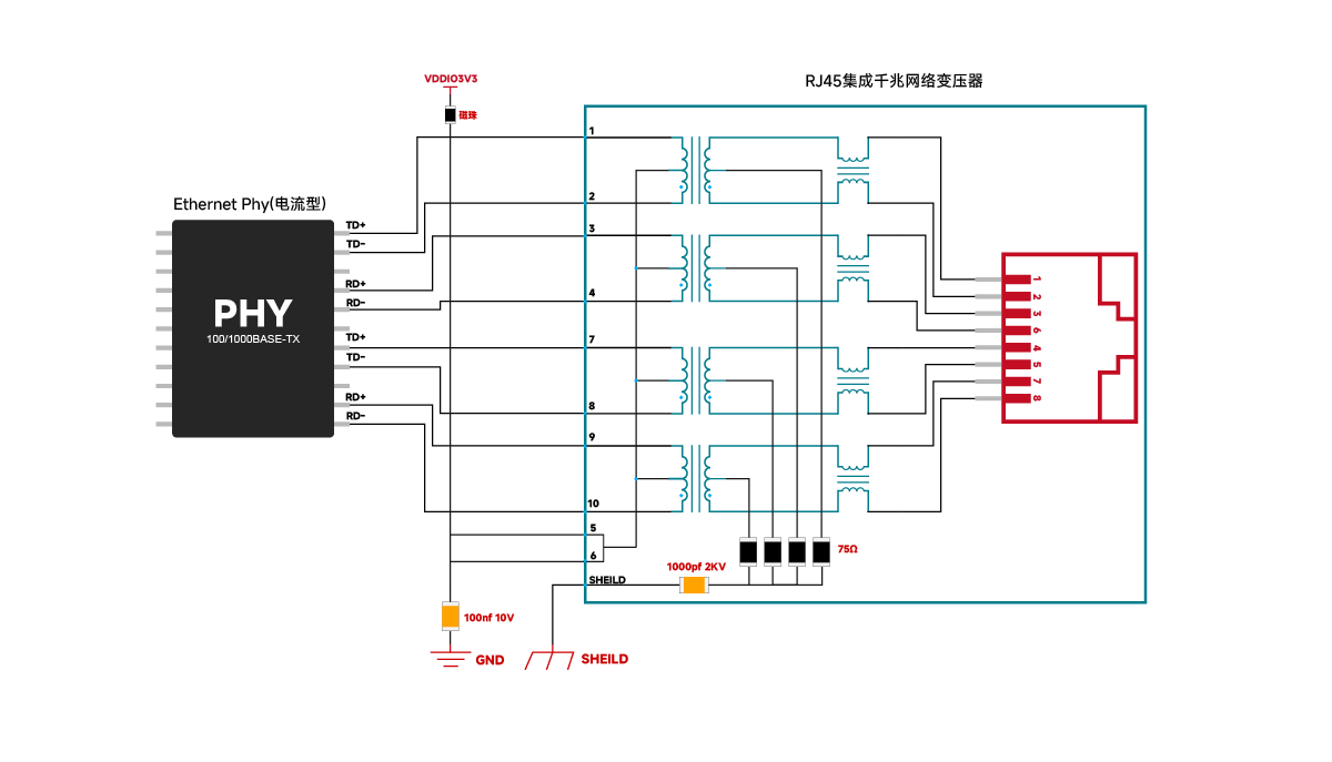 Connexion de billes magnétiques: pour le courant - Mode Phy, la bobine primaire doit être connectée à une bille magnétique, puis connectée à VCC de PHY pour filtrer le bruit de fréquence élevé et assurer la stabilité du signal.