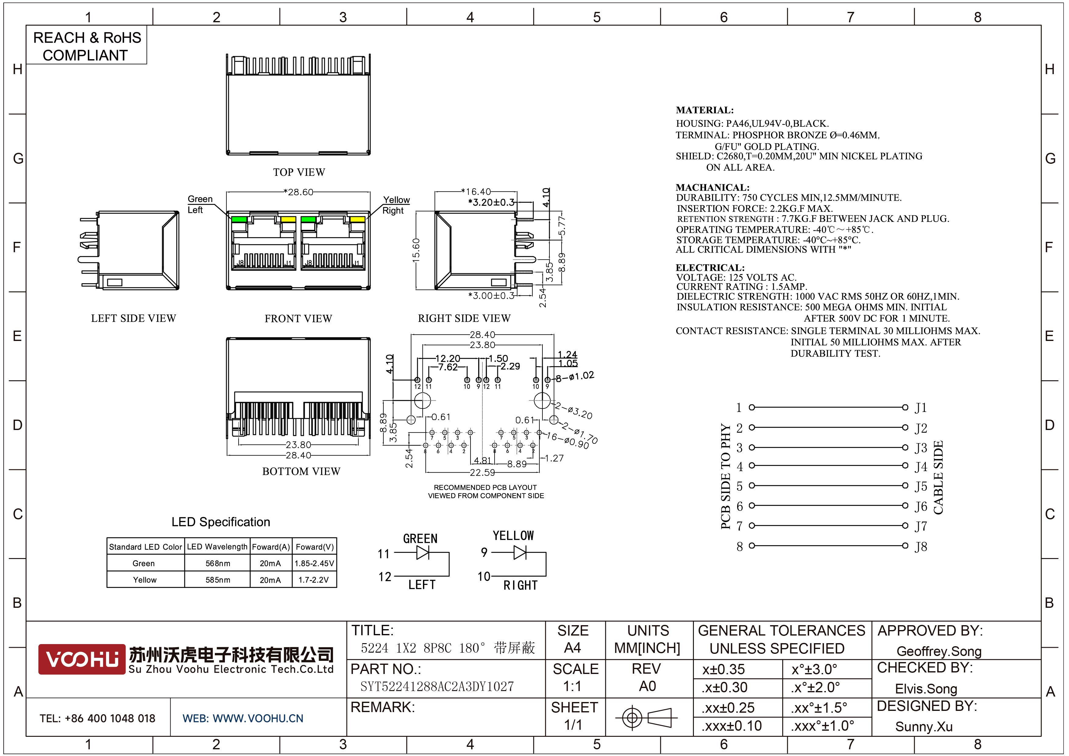 SYT52241288AC2A3DY1027 180° vertical 1*2 Tab UP LED green/yellow DIP RJ45