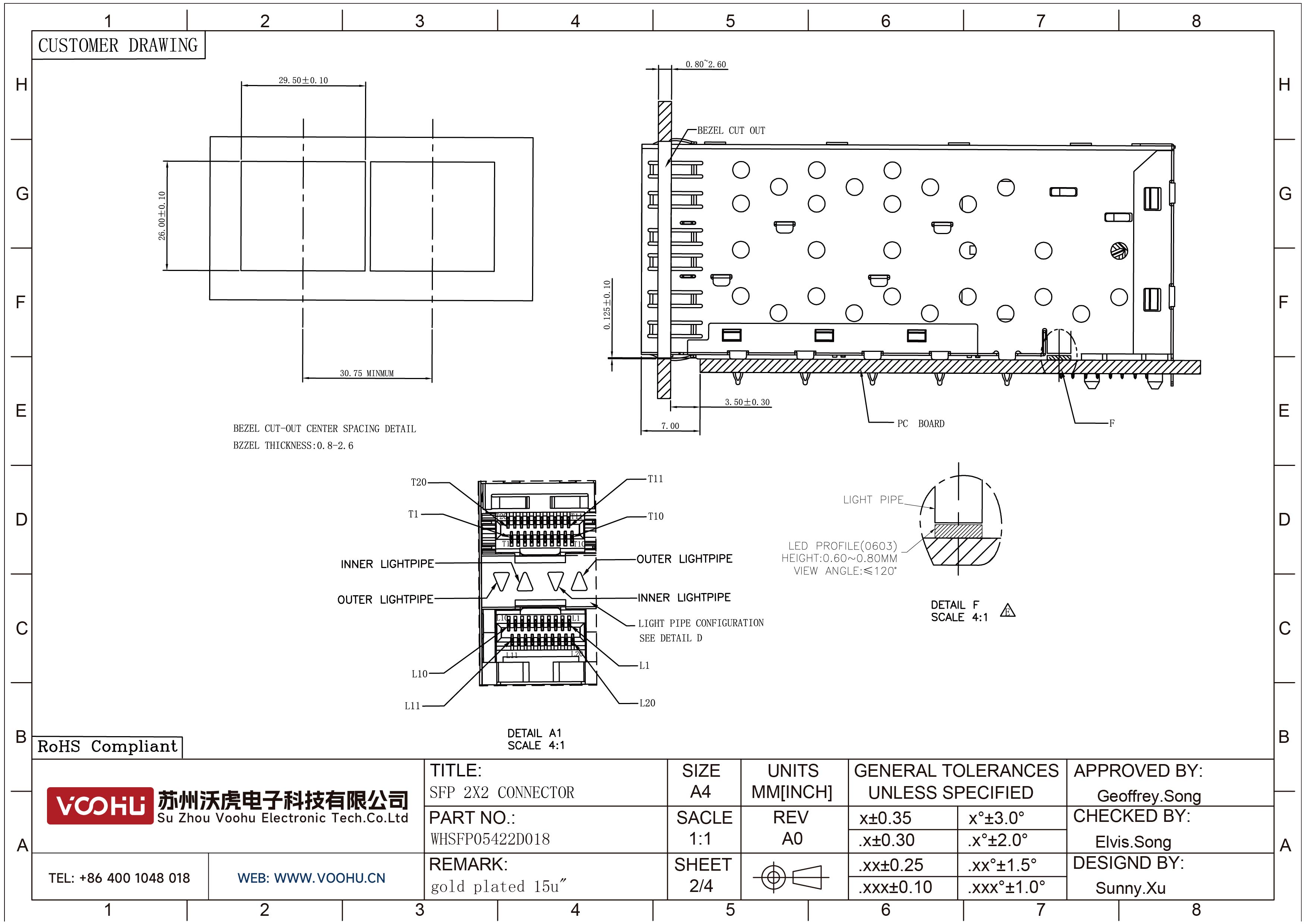 WHSFP05422D018 SFP 2×2 5G Cage+Connector Connector Gold Plated15U Fiber Optic cages