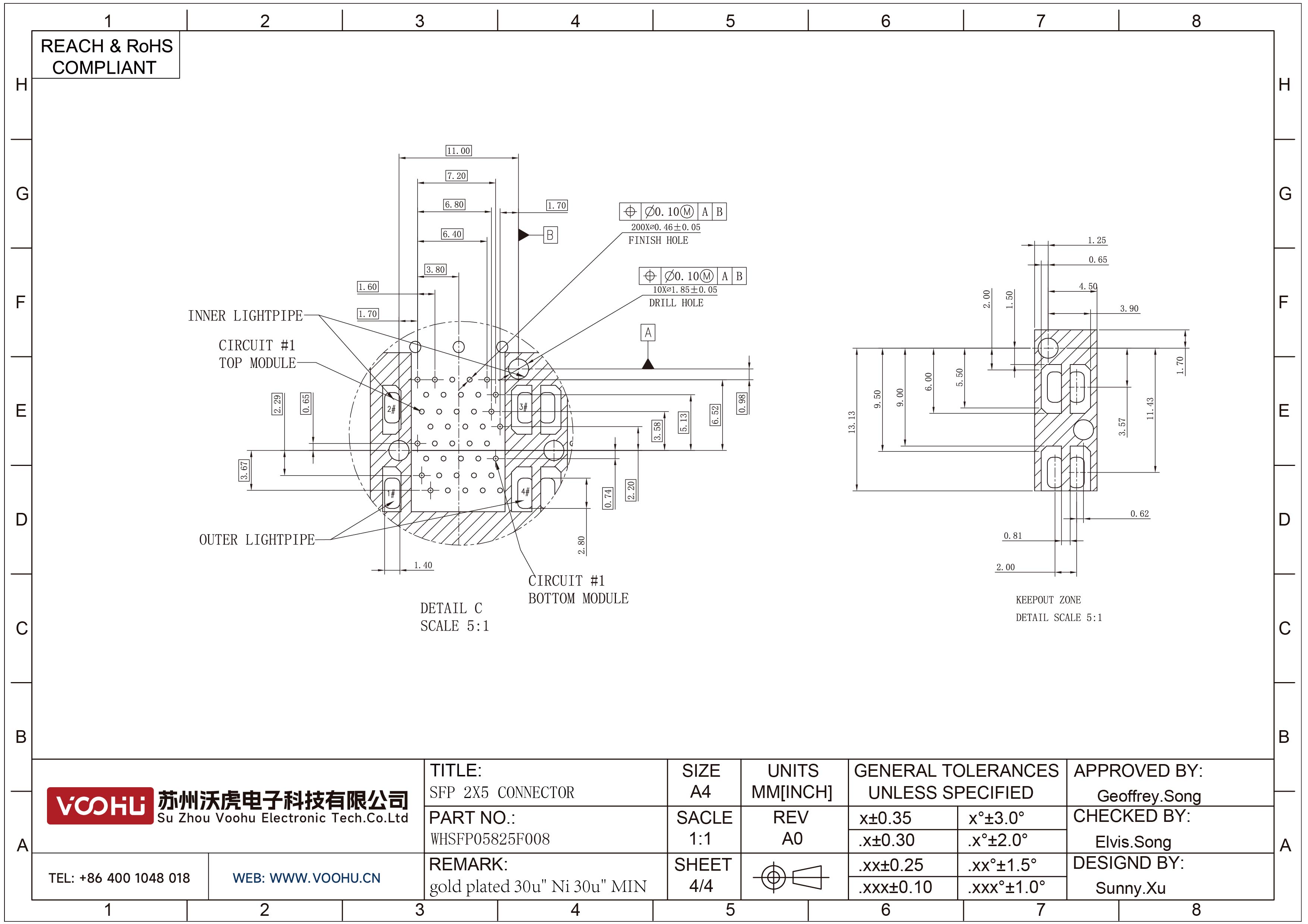 WHSFP05825F008 SFP 2×5 5G Cage+Connector Connector Gold Plated30U Ni 30U Fiber Optic cages
