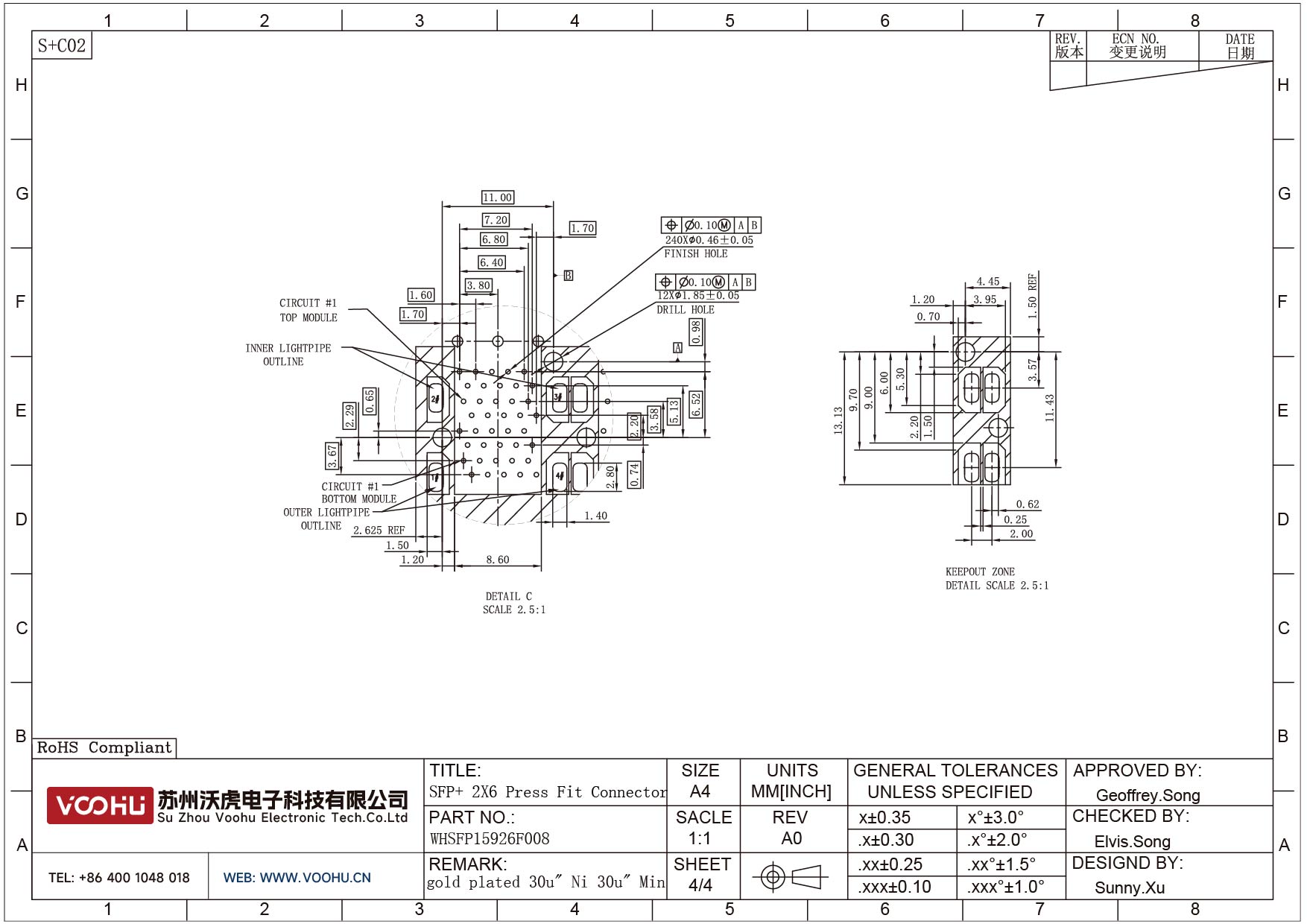 WHSFP15926F008 SFP+ 2×6 10G Press-Fit Cage+Connector Connector Gold Plated30U Ni 30U Fiber Optic cages
