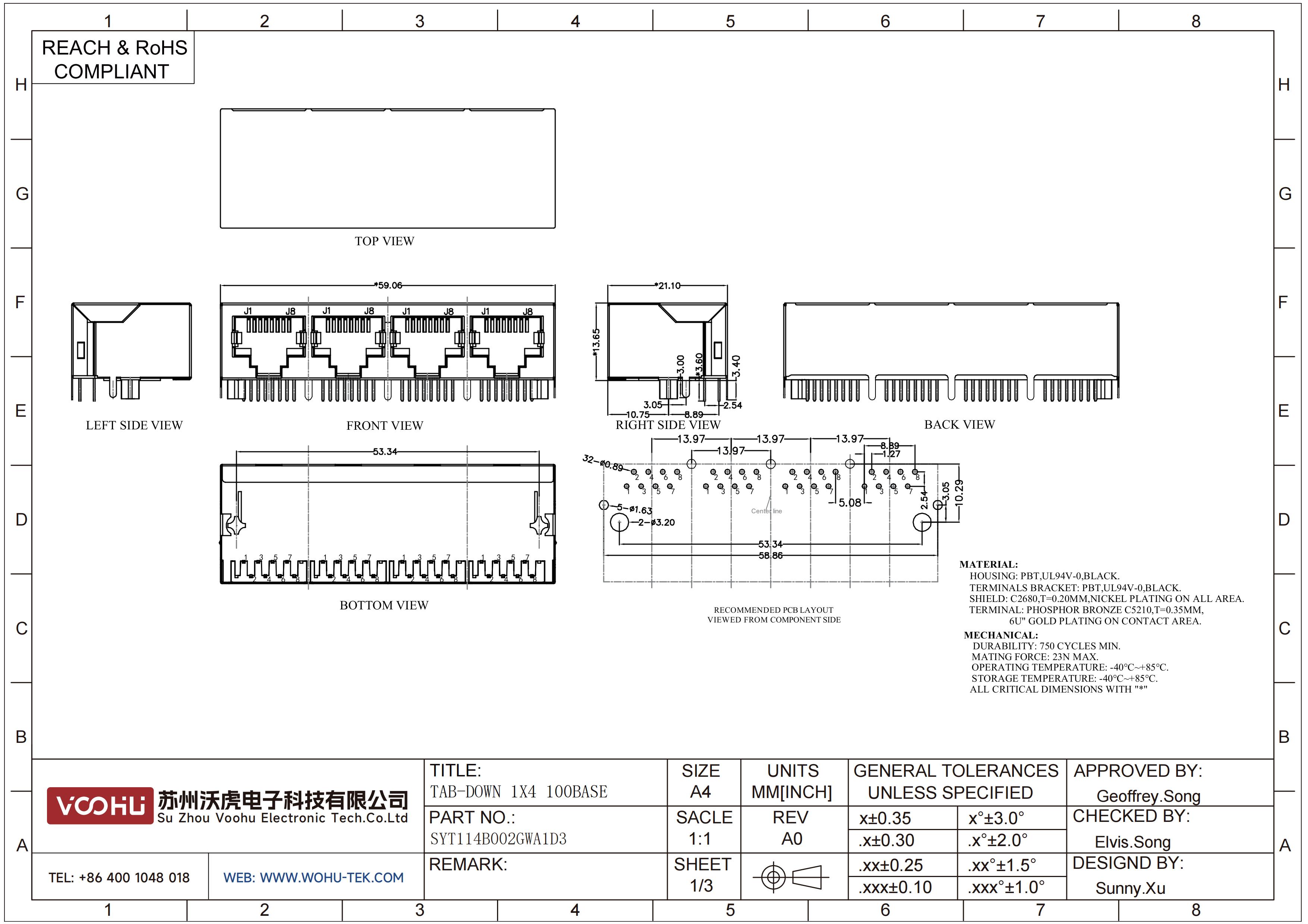 SYT114B002GWA1D3 90° side insertion 1*4 NO LED Tab Down 10/100M DIP RJ45
