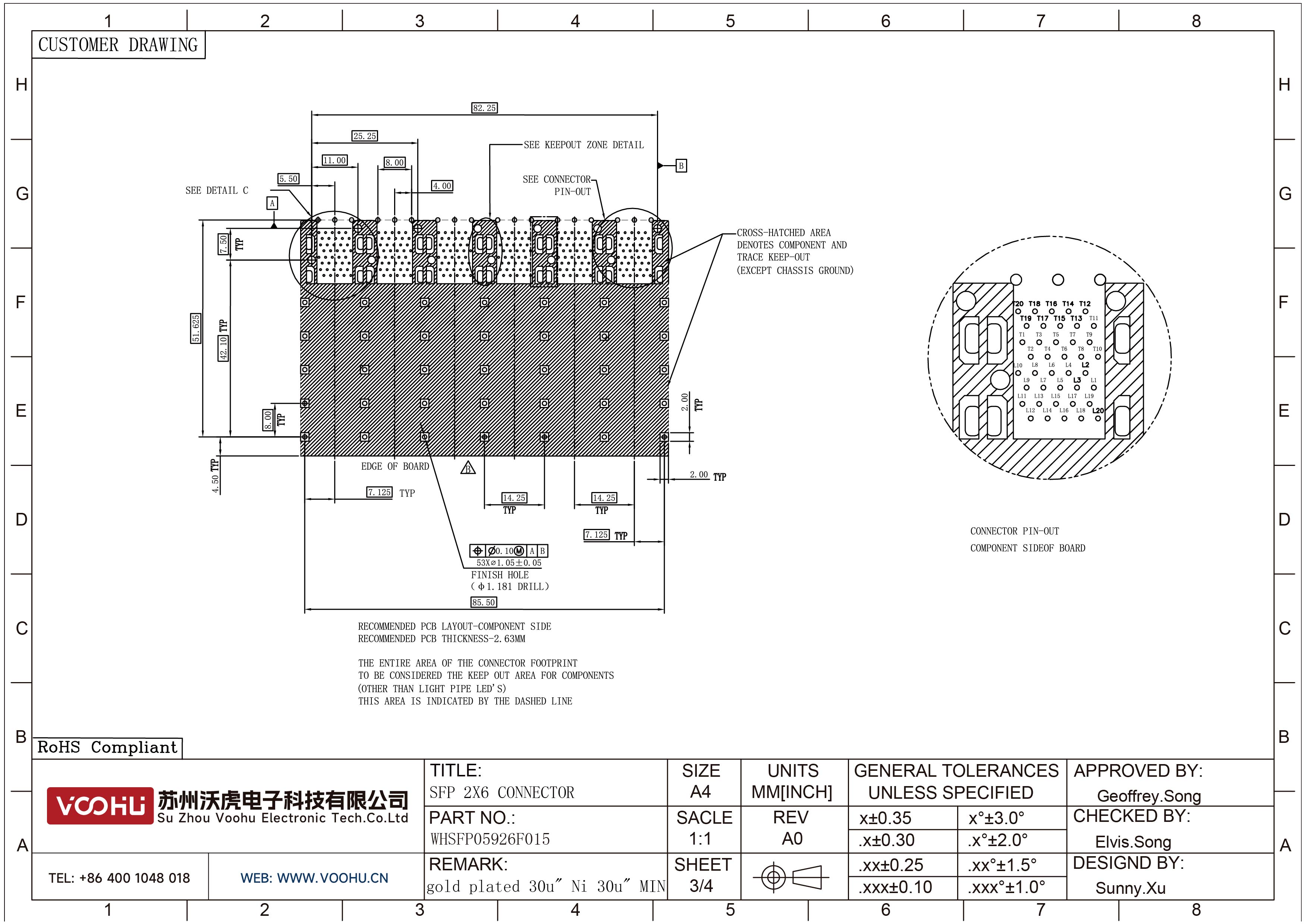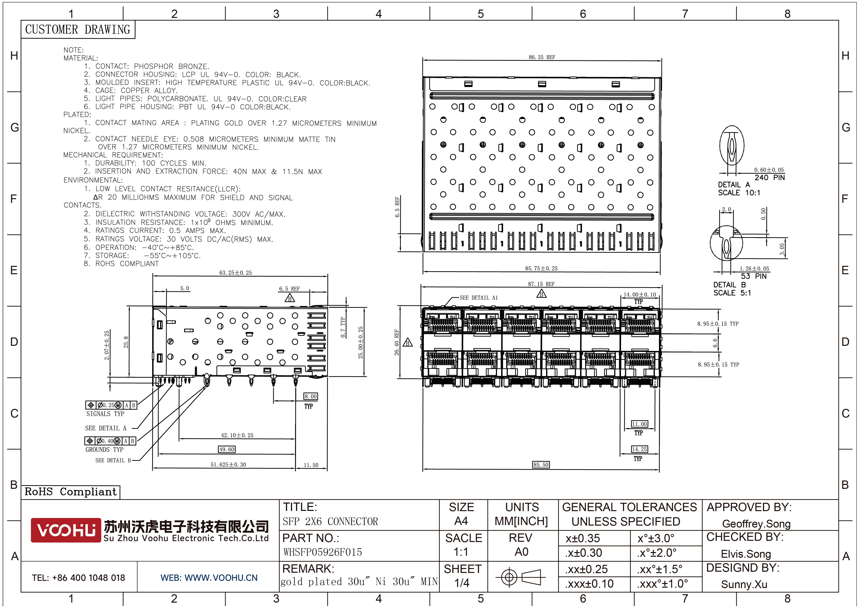 WHSFP05926F015 SFP 2×6 5G Cage+Connector Connector Gold Plated30U Ni 30U Fiber Optic cages