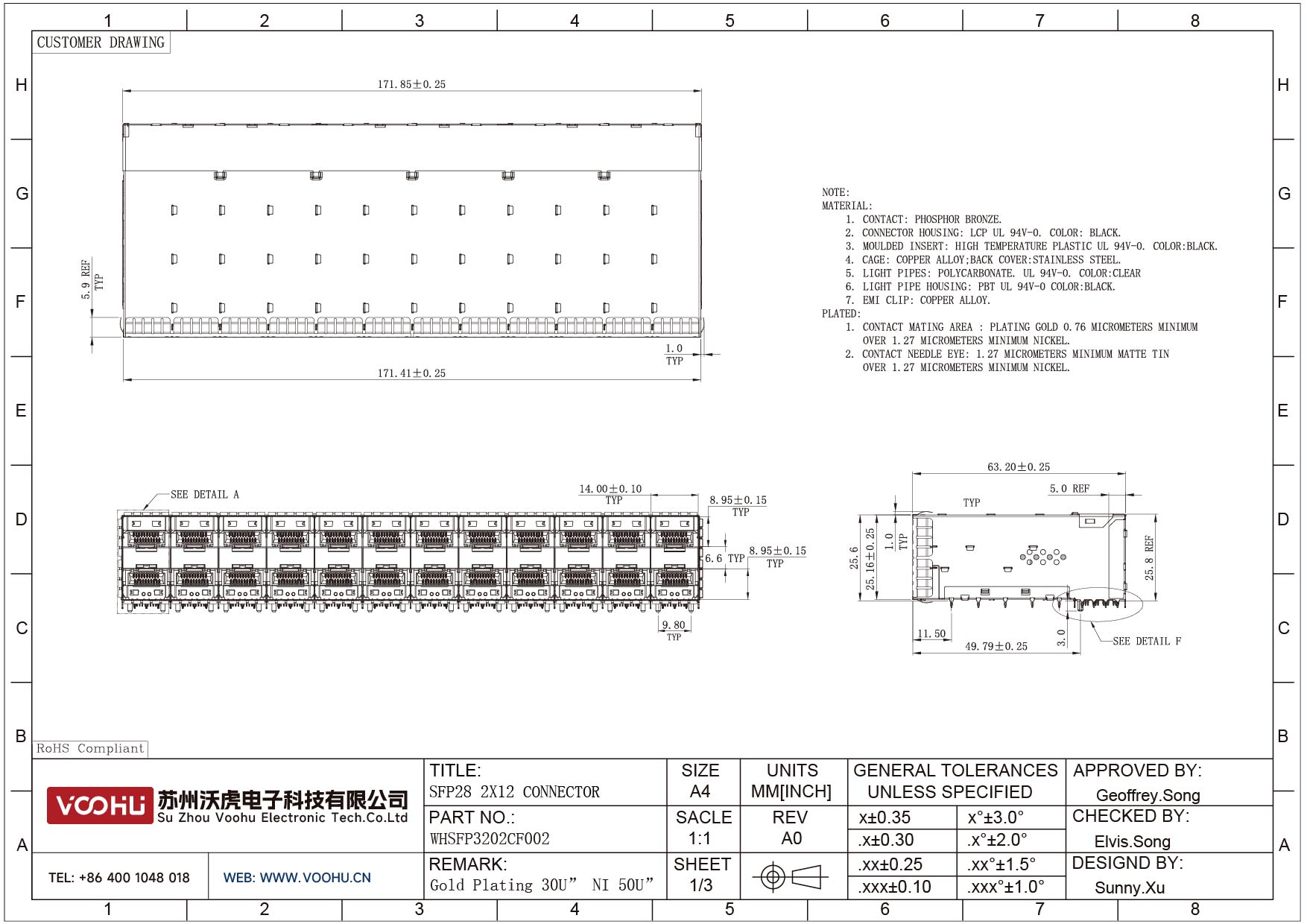 WHSFP16228F015 SFP+ 2×8 10G Press-Fit Cage+Connector Connector Gold Plated30U Ni 30U Fiber Optic cages