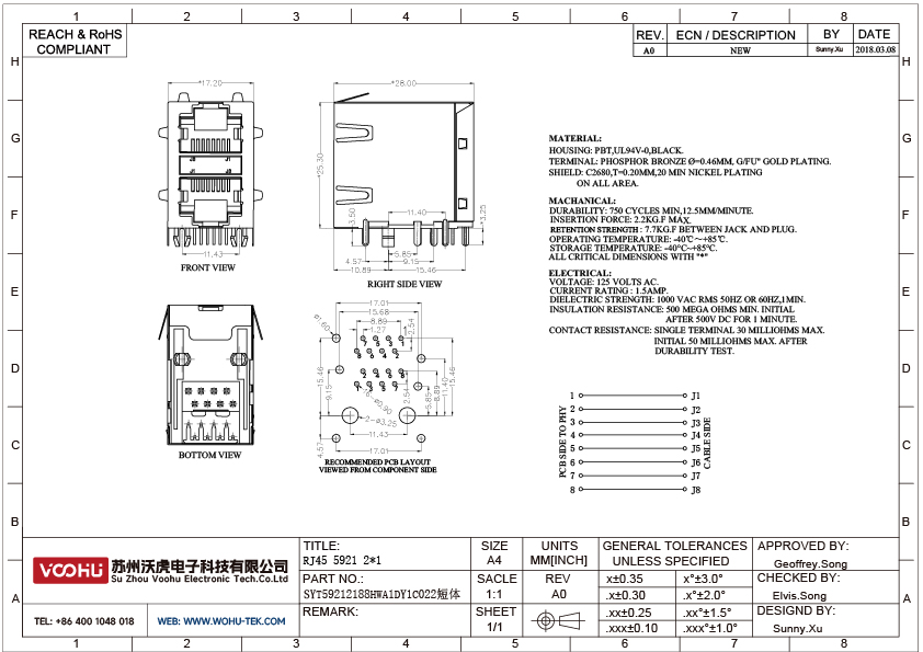 SYT59212188HWA1DY1C022Short body 5921 2*1 No light With shrapnel RJ45 connector
