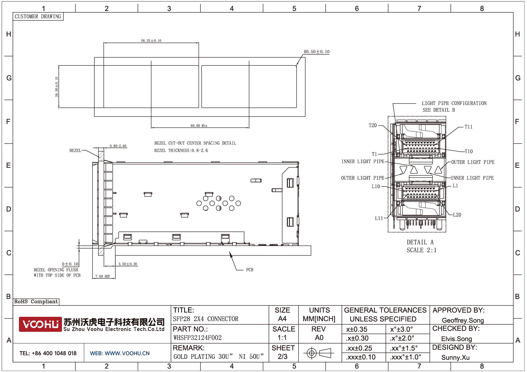 WHSFP05926F015 SFP 2×6 5G Cage+Connector Connector Gold Plated30U Ni 30U Fiber Optic cages