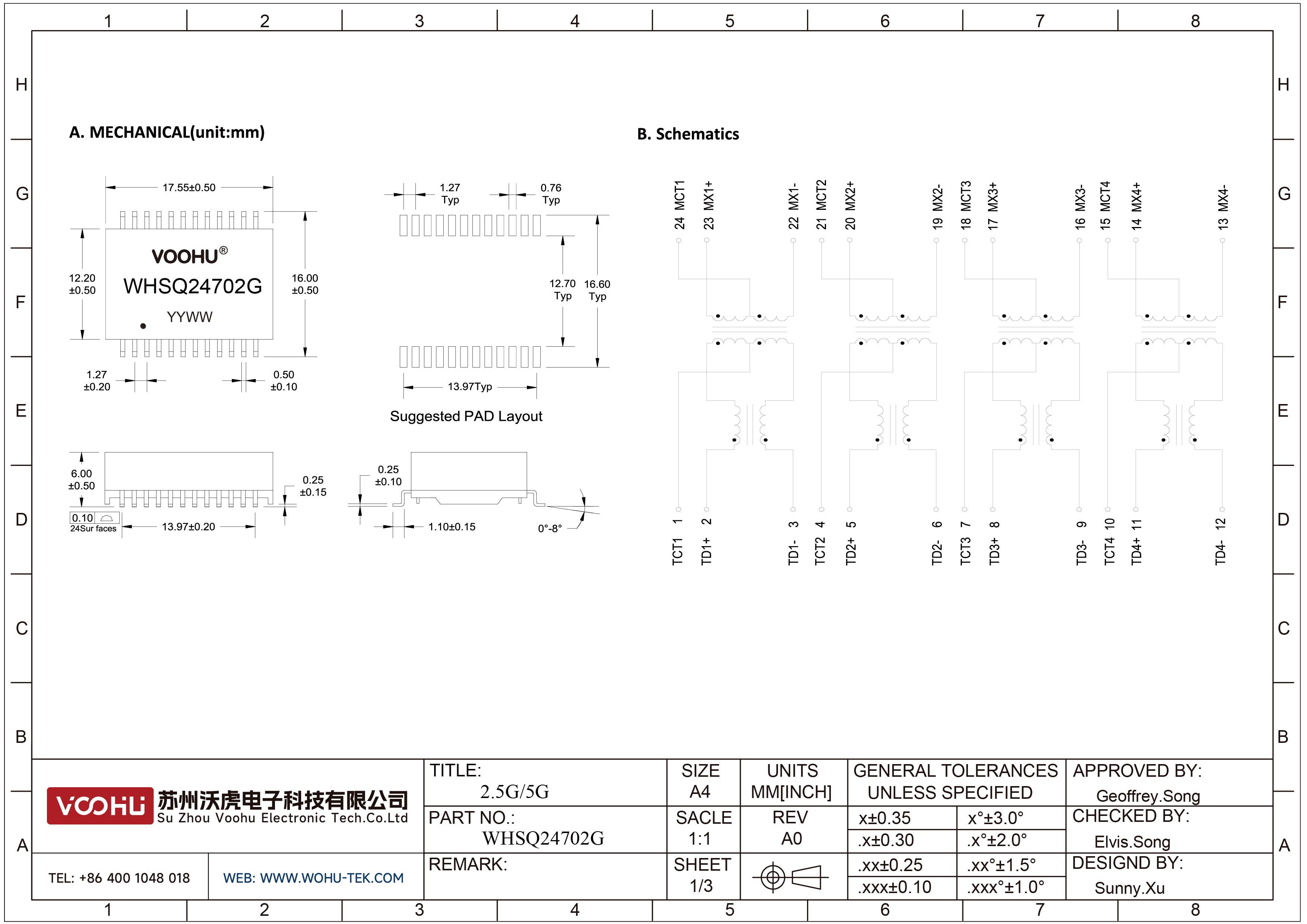 WHSQ24702G Single Port SMD 2.5G/5G PIN24 Lan Transformer