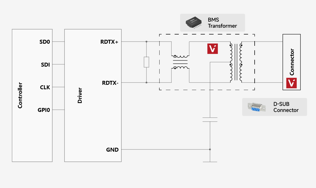 In a BMS, the high-voltage and low-voltage side MCUs of the battery pack must be isolated. Traditional solutions require a 4-channel digital isolator, while isoSPI only requires a small transformer, significantly reducing costs. This isolation capability not only protects the low-voltage side processor from high-voltage surges but also greatly improves common-mode rejection, ensuring measurement accuracy.