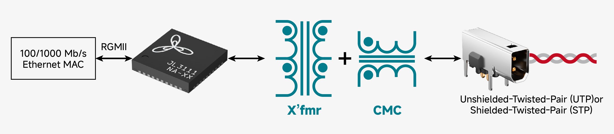 This solution is used for single-pair twisted-pair communication, supports RMII 100Mbps data rates, and complies with IEEE 802.3bw.
