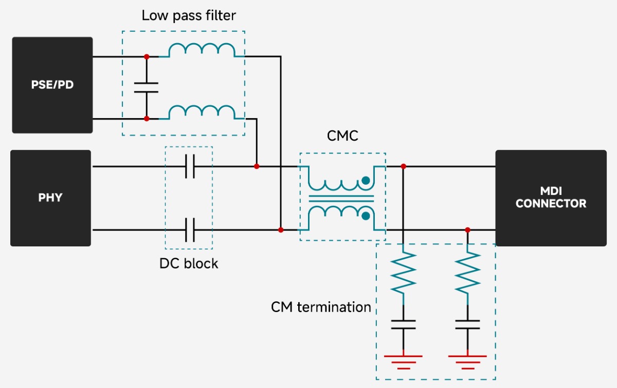 The basic circuit design of the SPE requires a common-mode current transformer (CMC) and common-mode node termination to suppress common-mode noise, and a DC blocking capacitor.